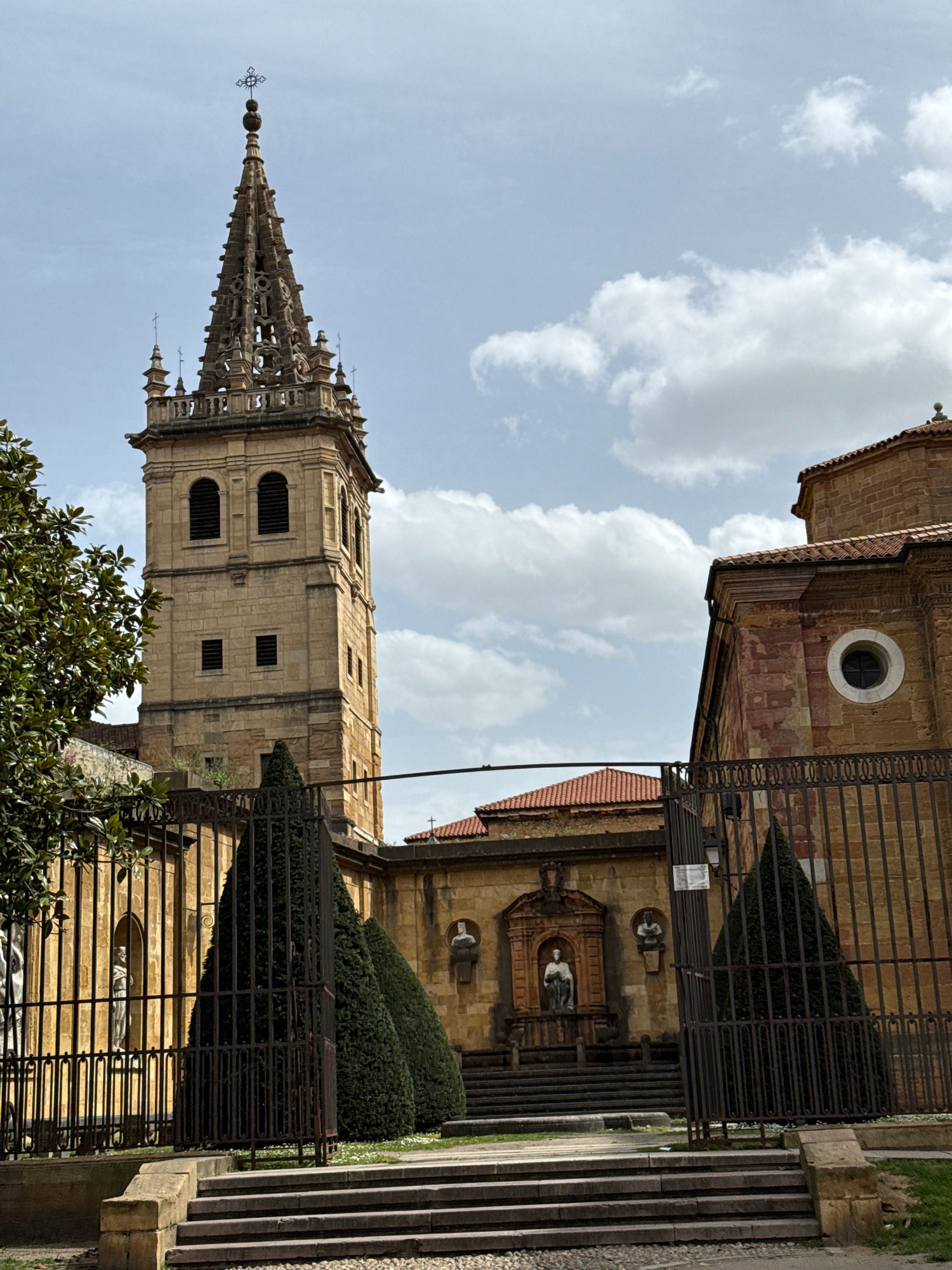 The image features a view of the Metropolitan Cathedral Basilica of the Holy Savior in Oviedo, Spain. The foreground includes a wrought-iron fence and some greenery. The tower of the cathedral rises p…read more