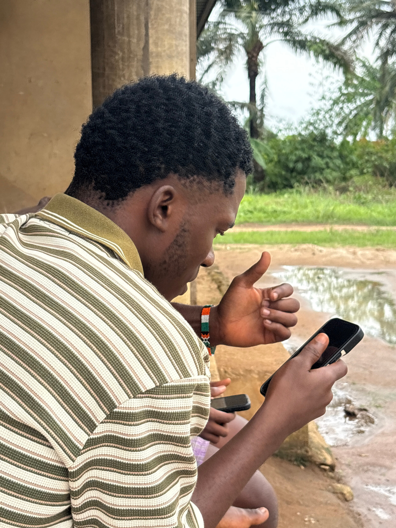 A man with dark skin, dressed in a striped shirt with a dark green collar, is looking at a smartphone in his right hand. His left hand is raised, thumb extended upwards. The man has dark hair and a short beard. He is wearing a beaded bracelet. Another person can be seen in the background, holding a phone. The backdrop includes grass and what appears to be a puddle or wet area. The environment suggests a possibly rural or semi-rural location. It's difficult to confirm that the location is Ikot Ekpene, Nigeria without additional context or reference points visible in the image. | Open Wire