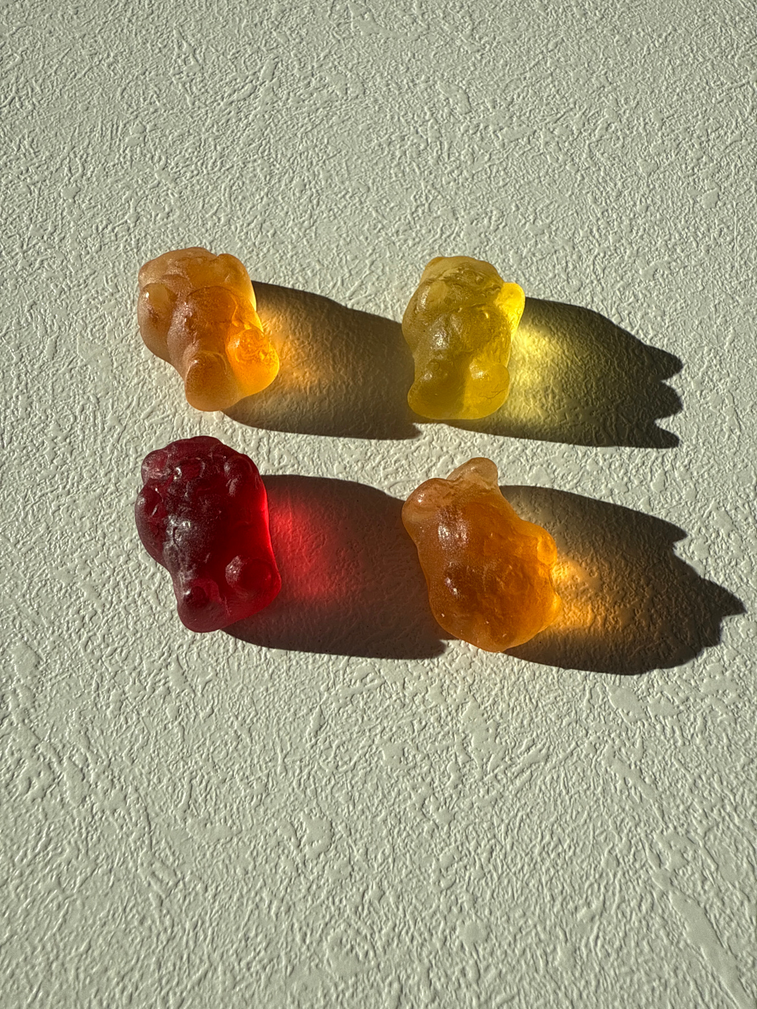 The image shows four gummy bears placed on a textured white surface, likely a wall or a similar flat surface. The gummy bears are of different colors: yellow, orange, orange, and red. Each gummy bearβ¦read more
