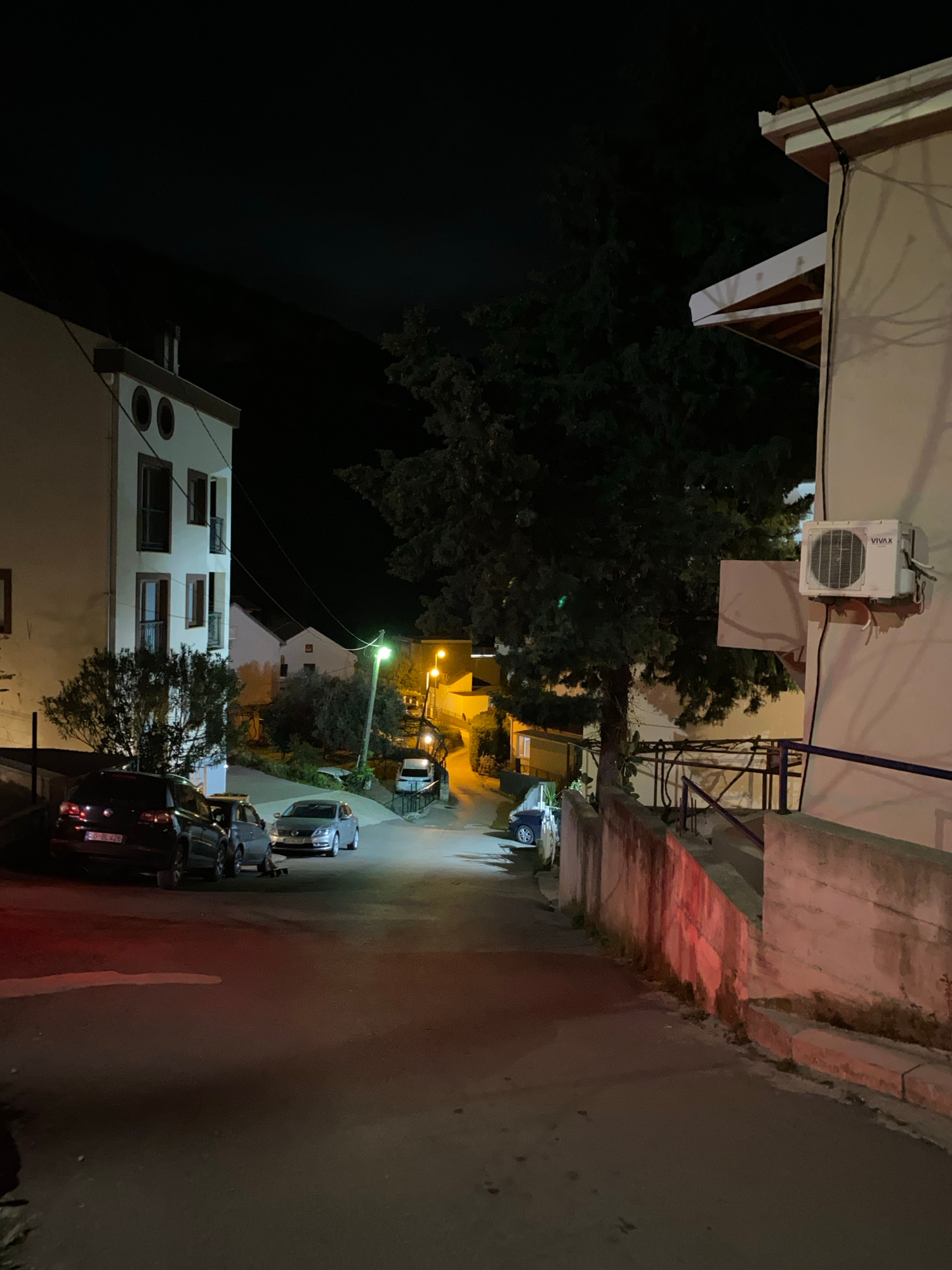 The image shows a narrow street in Budva, Montenegro at night. The street is flanked by buildings on both sides. On the left side of the street is a light-colored building with multiple windows and an…read more