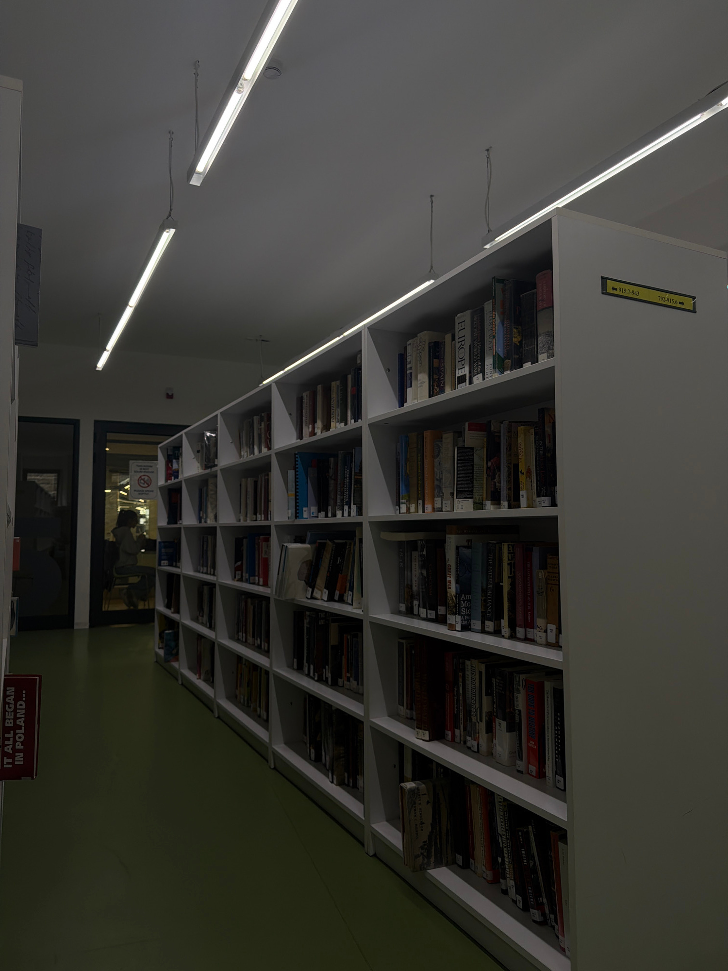 The image shows a library with ceiling-high bookshelves filled with books in an indoor setting. The location is unknown, but there is no evidence it is located in Yerevan, Armenia. The shelves are whi…read more