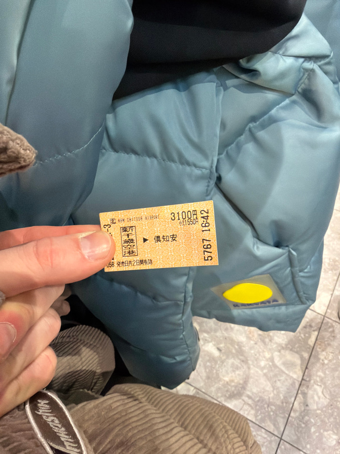 A human hand, displaying trimmed fingernails, holds a single orange-yellow paper ticket over the lap of an individual in an indoor public space. The ticket is for travel from "NEW CHITOSE AIRPORT" (新千…read more