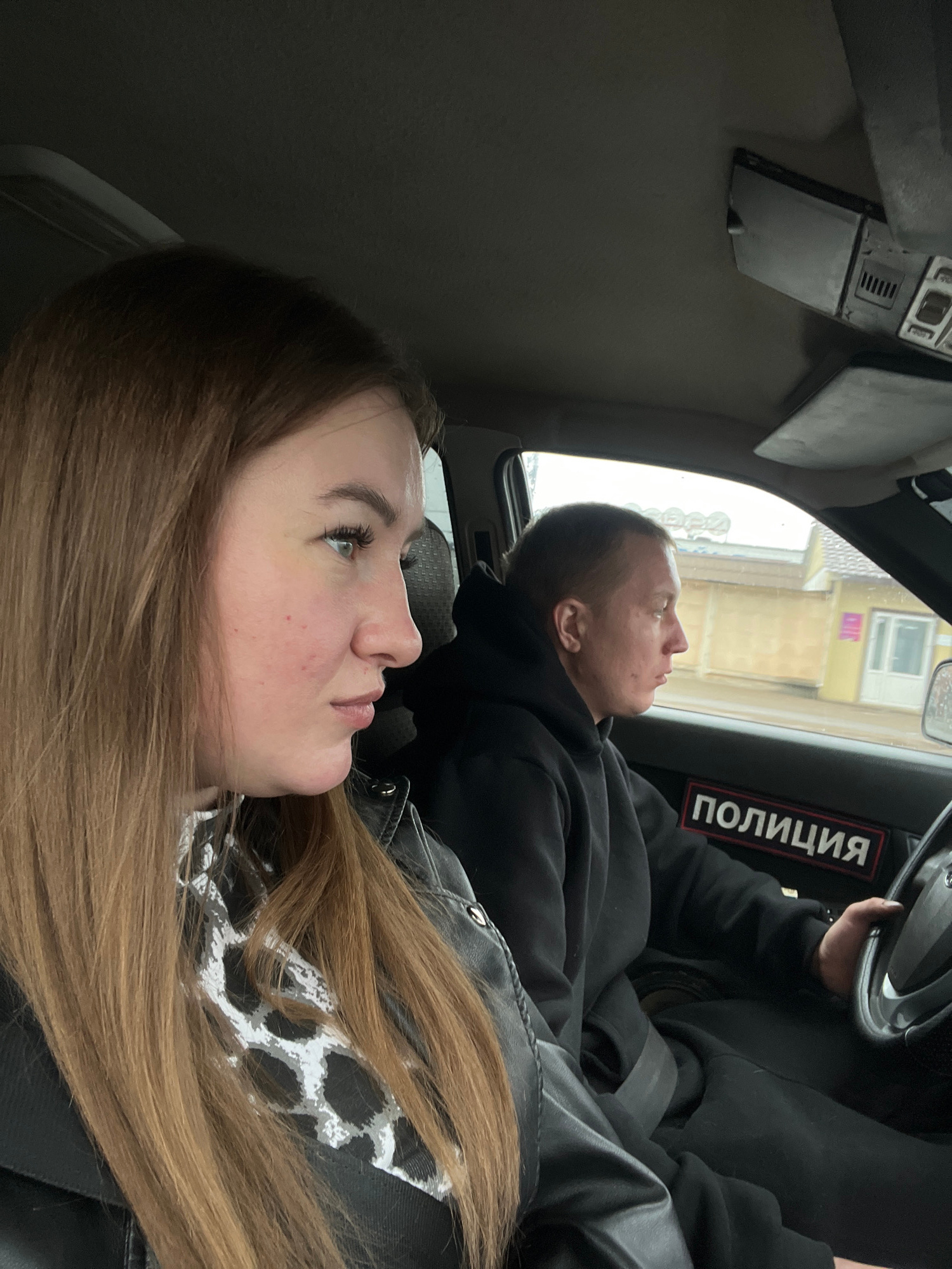 Two people are in a car. One person is driving and the other is a passenger. The driver appears to be a male with short hair and is wearing a black sweatshirt. The passenger appears to be a female wit…read more