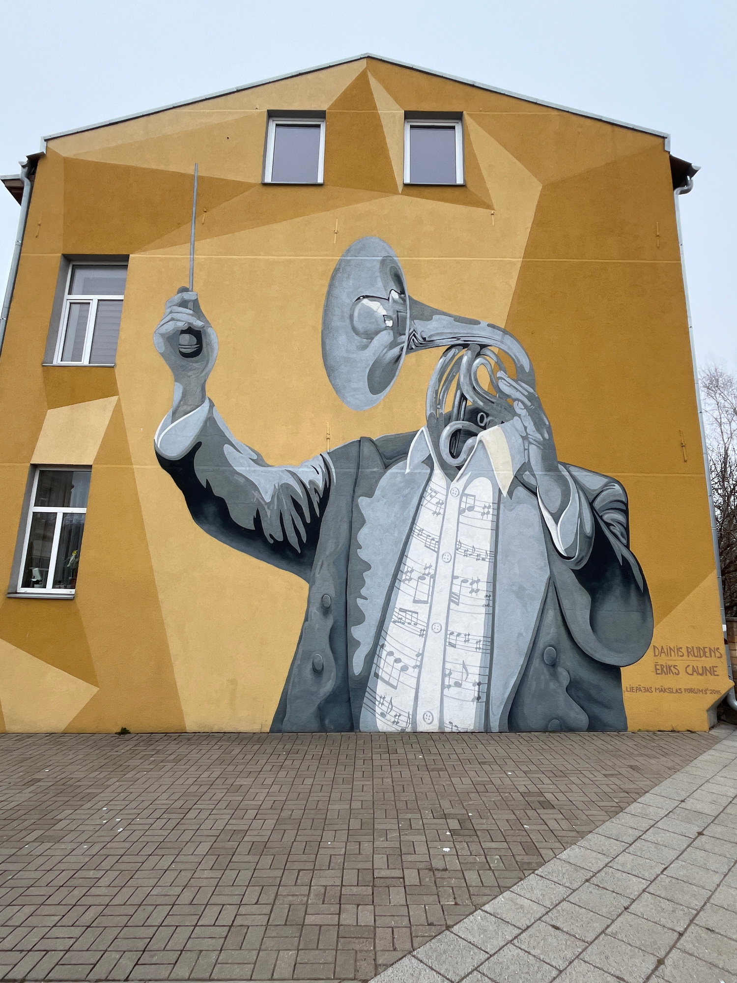A low-angle shot depicts a building with a mural on its side in Liepaja, Latvia. The mural, executed in shades of gray against a muted yellow background, features a stylized representation of a conduc…read more