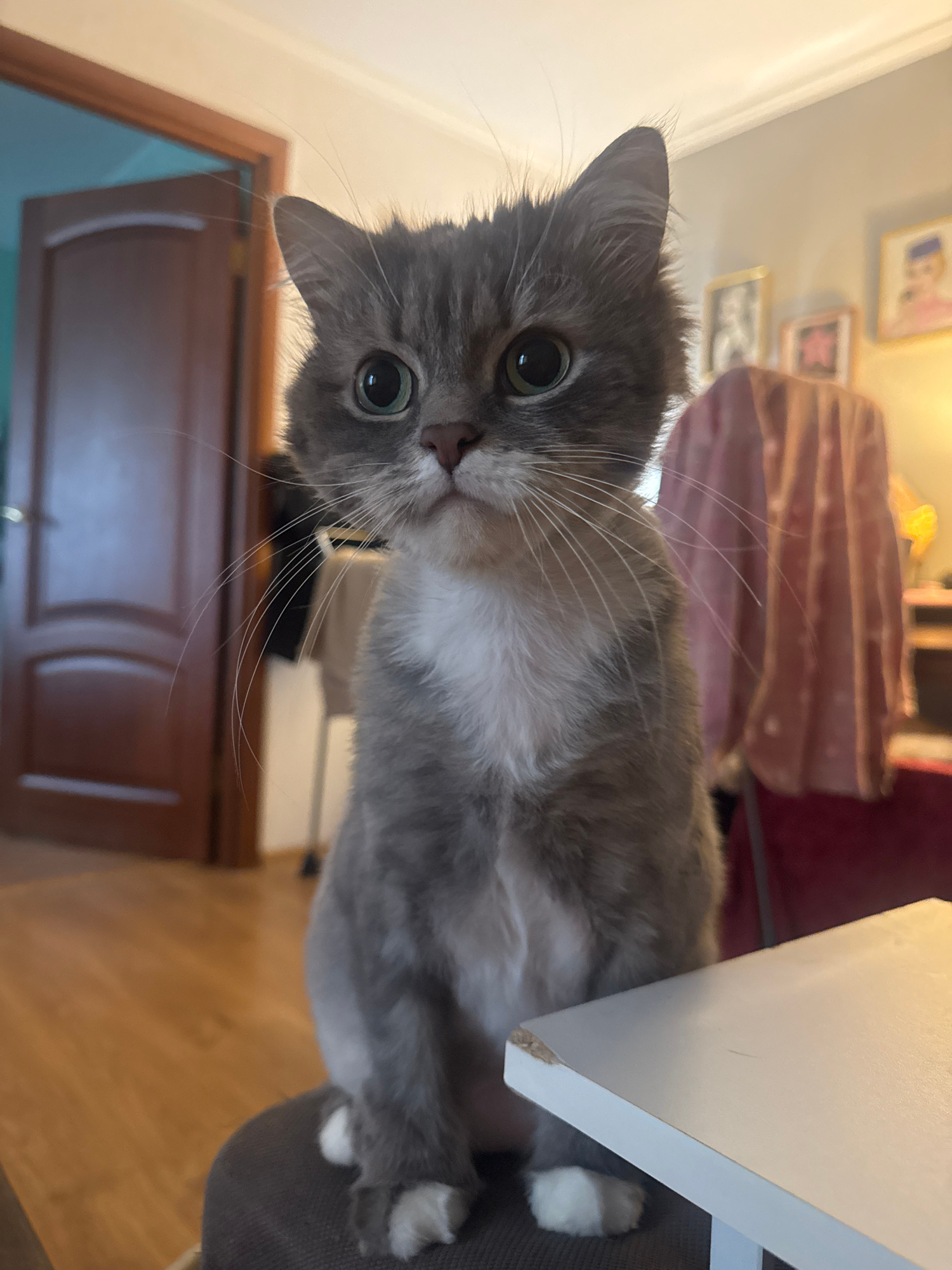 A grey and white domestic cat is looking at the camera. The cat has green eyes. The background is blurry, but a brown wooden door is visible. A white table is to the cat's right. The cat appears to be…read more