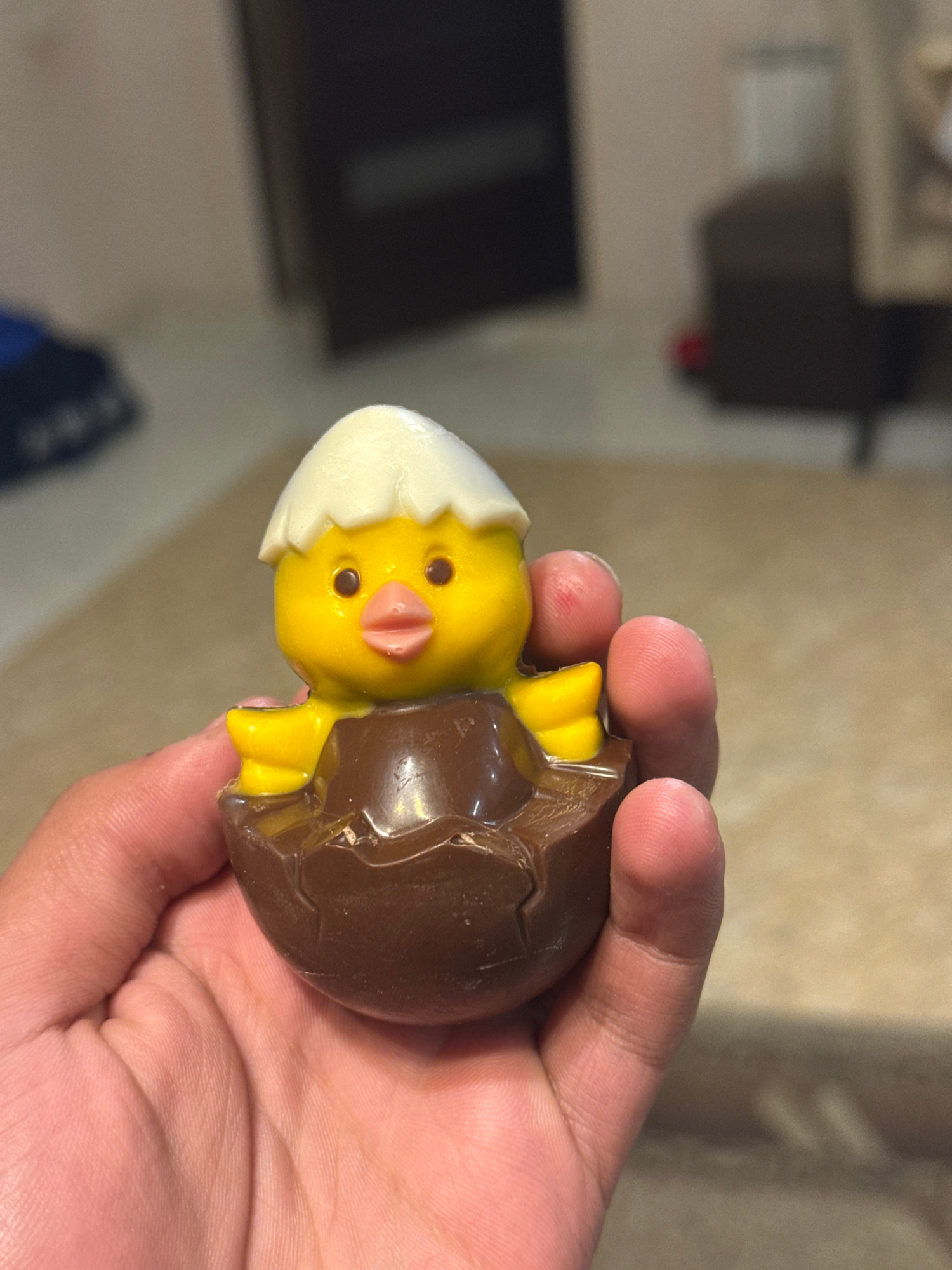 A hand holds a chocolate egg containing a yellow chick. The egg is broken open, revealing the chick inside. The chick has a white head and a pink beak. The background is blurry, but it appears to be a…read more