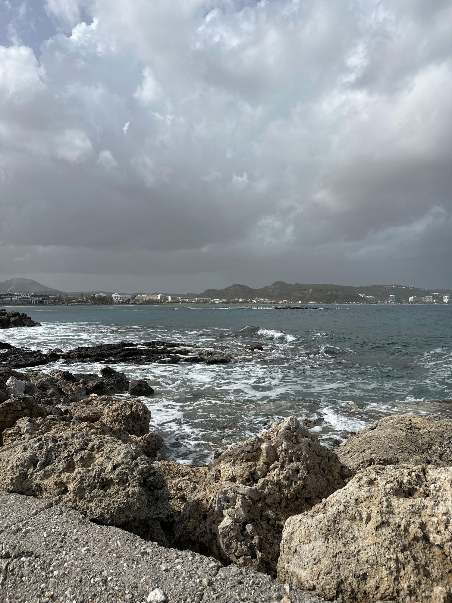 The image depicts a coastline near Faliraki, Greece, on a cloudy day. Large, rough, light-colored rocks form the immediate foreground, transitioning into a darker, more jagged rocky shoreline where th…read more