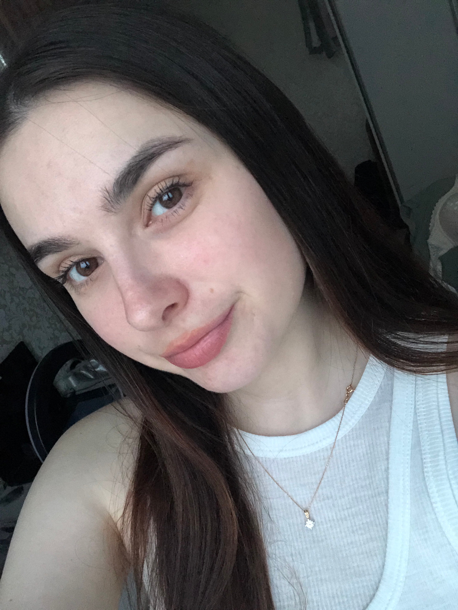 A selfie of a woman with long, dark brown hair. She is wearing a white tank top and a delicate gold necklace with a small pendant. The background is blurry and indistinct, but includes a dark, possibl…read more