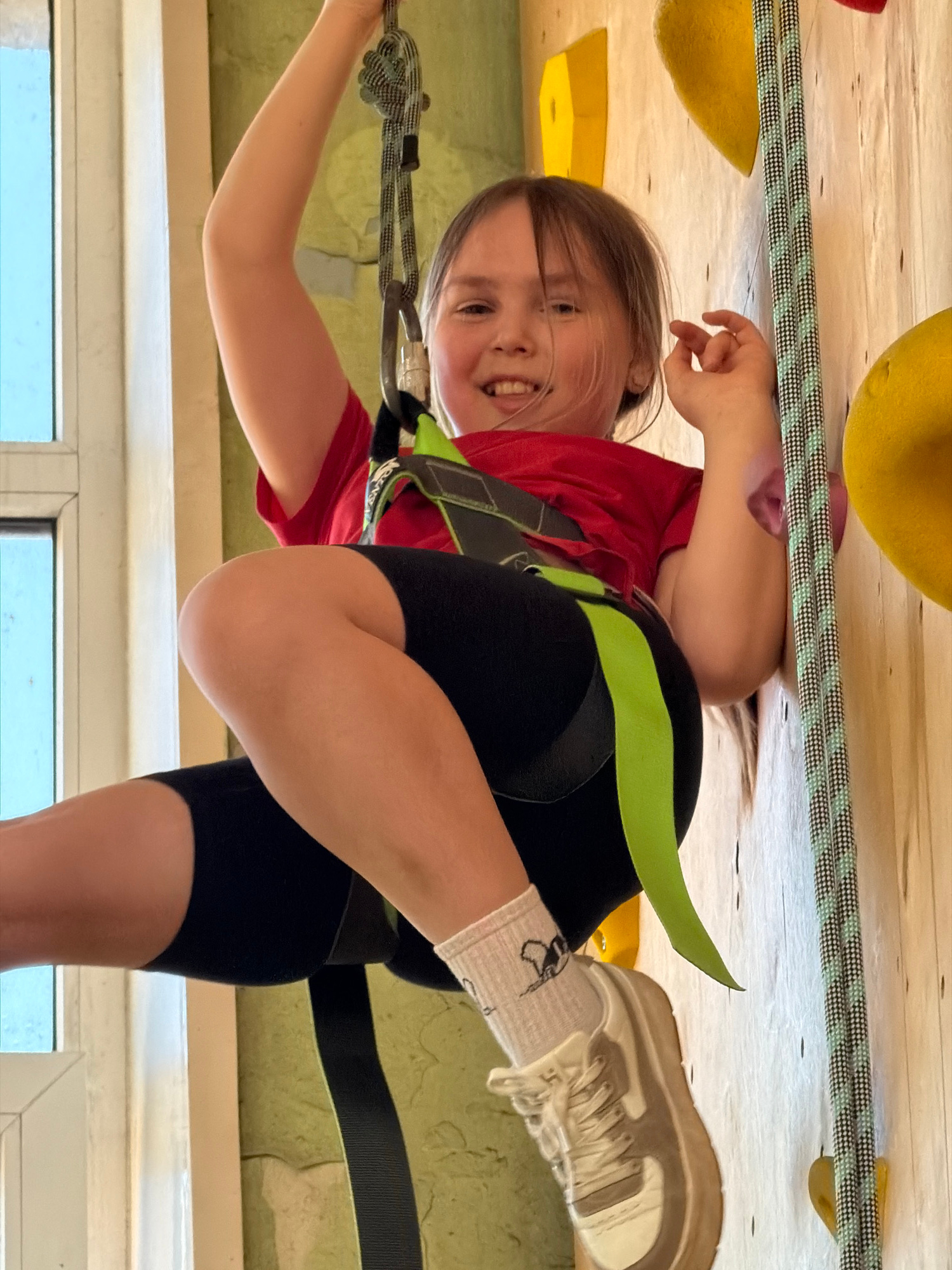 A young girl is depicted mid-activity in an indoor climbing facility, likely in Izhevsk, Russia. She is seen smiling broadly and looking directly at the camera, expressing joy and enthusiasm. The gir…read more