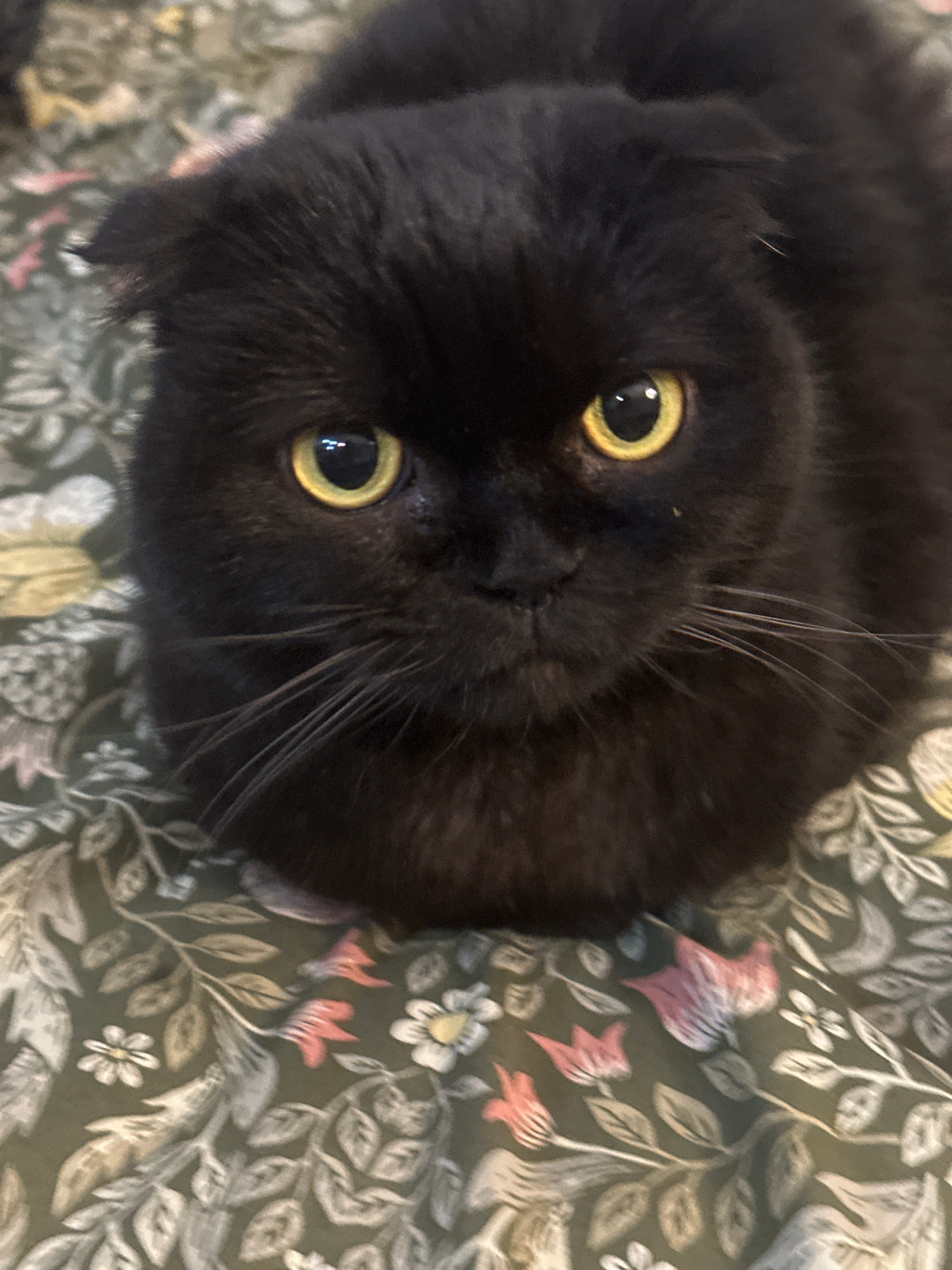 A black cat with yellow eyes lies on patterned fabric. The fabric has a floral pattern of green, white, pink and gray colors. The image appears to have been taken indoors. There are no people visible…read more