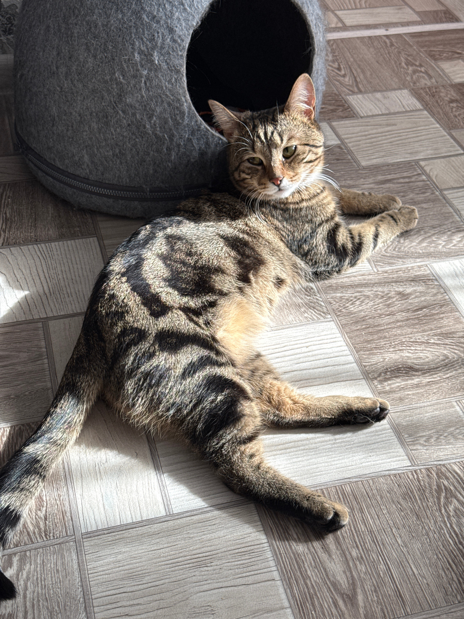 A domestic tabby cat lies on its back on a gray, wood-patterned floor next to a gray, felt cat bed. The cat's head rests just outside the bed, and its body stretches out into the room. The cat's front…read more