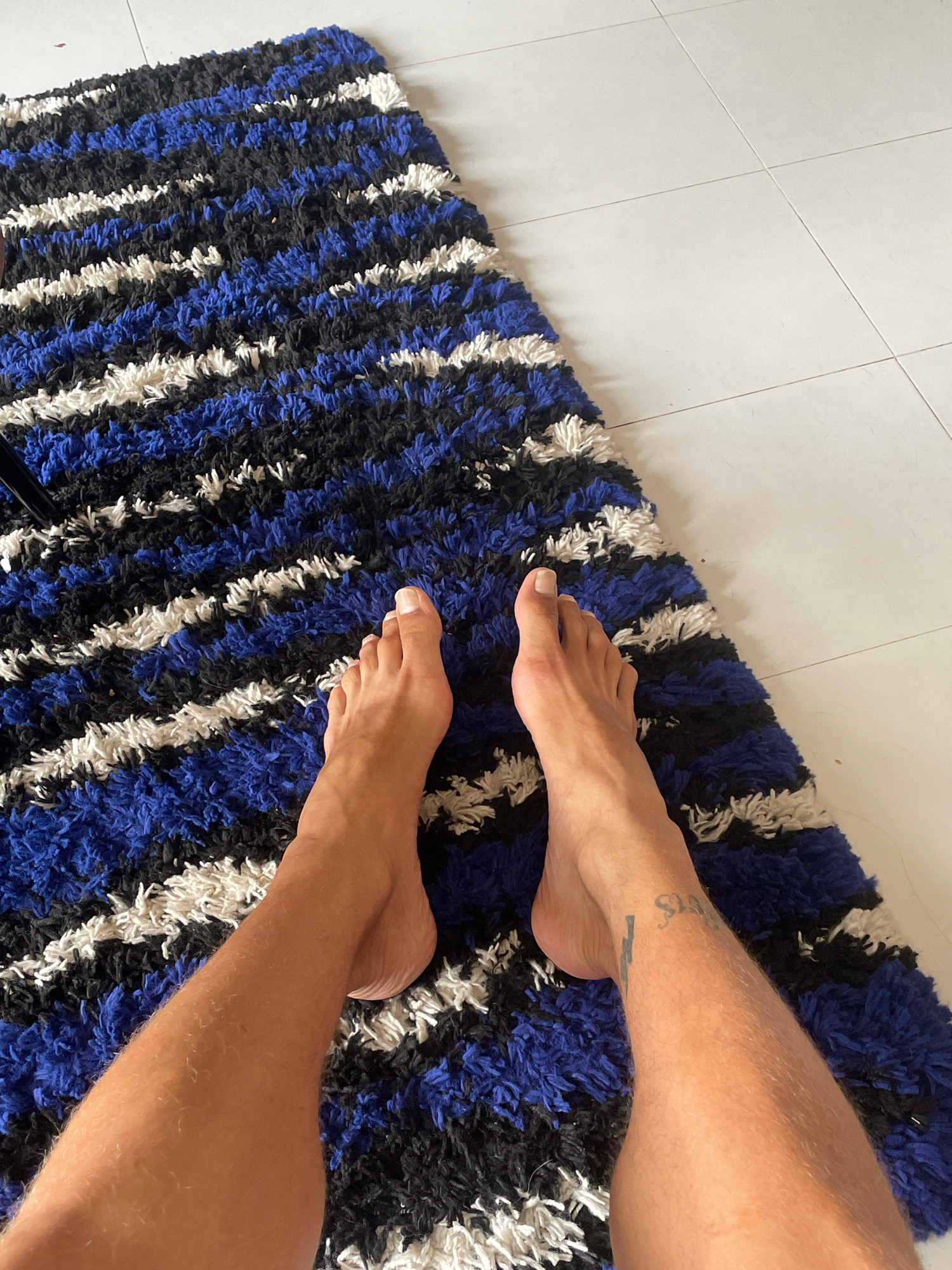 A pair of legs and feet are positioned on a shaggy rug with alternating stripes of white, blue, and black. The rug lies partially on a tiled floor. The legs are fair-skinned, and the lower leg has a t…read more