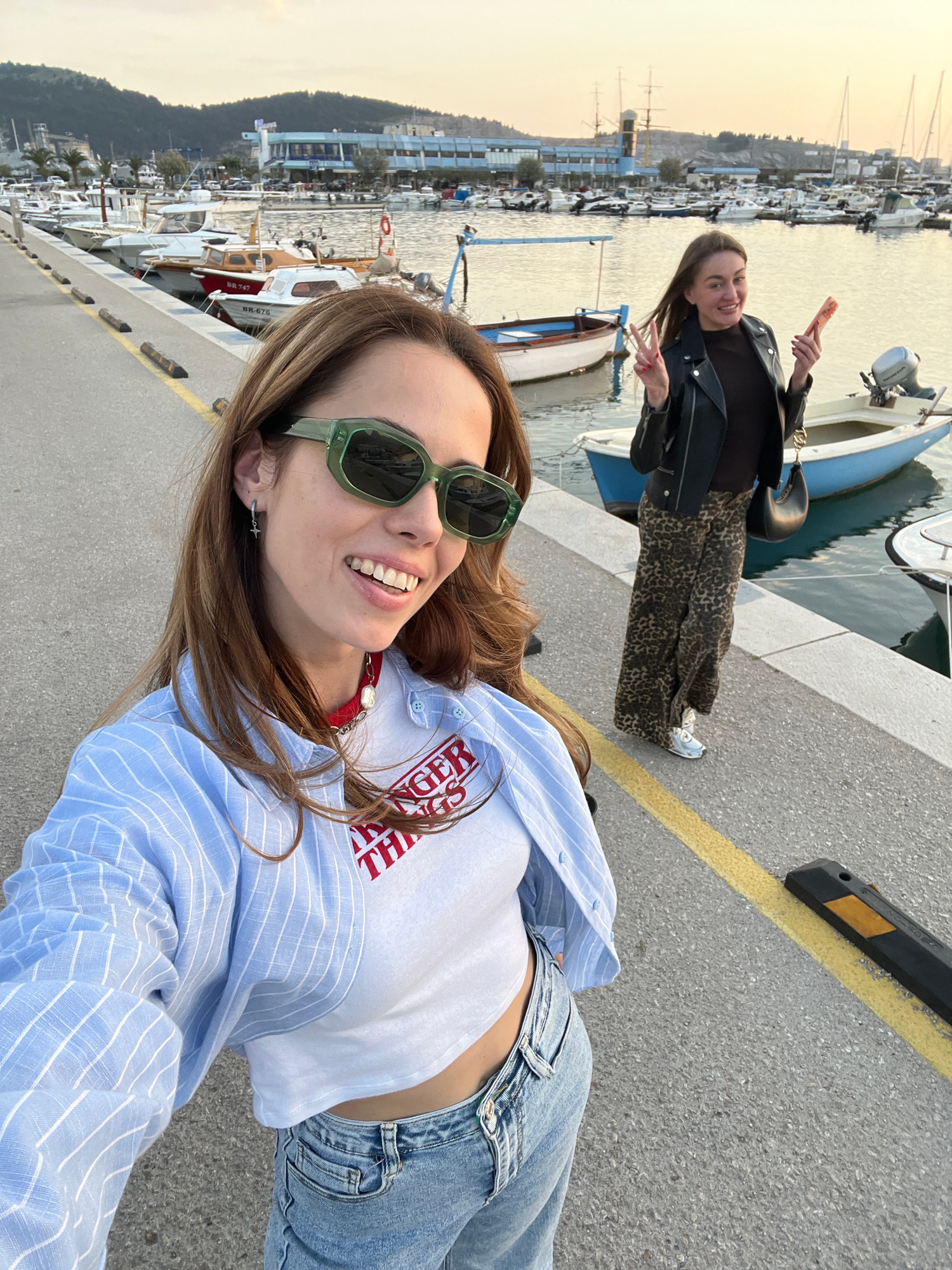 The image captures two women in a harbor setting. The woman in the foreground is smiling at the camera, wearing light-wash denim jeans, a white cropped t-shirt, and a light blue striped button-up shir…read more