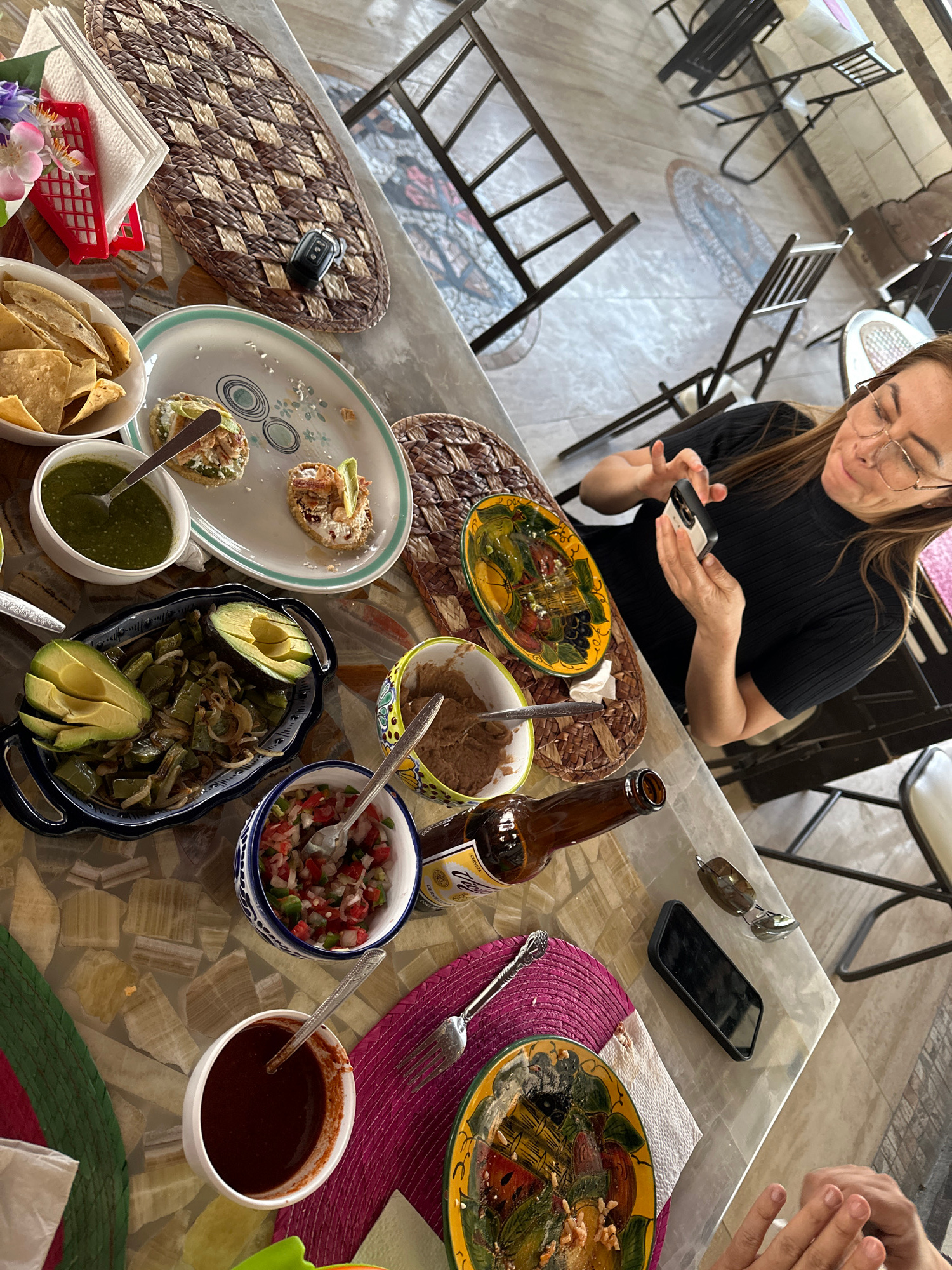 A woman wearing glasses and a black short-sleeved shirt is seated at a table, looking at her smartphone. The table is covered with various dishes of food, including tostadas, salsa, avocado, and chips…read more