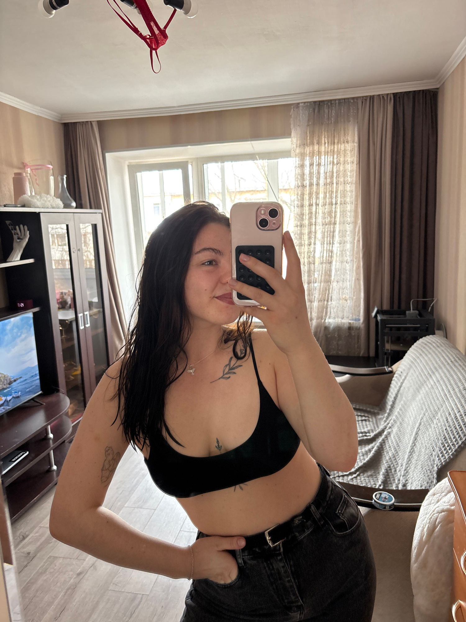 A young woman with dark hair and a fair complexion poses for a mirror selfie inside an apartment. She is wearing a black sports bra and dark jeans. A phone with a light pink case is held up, obscuring…read more