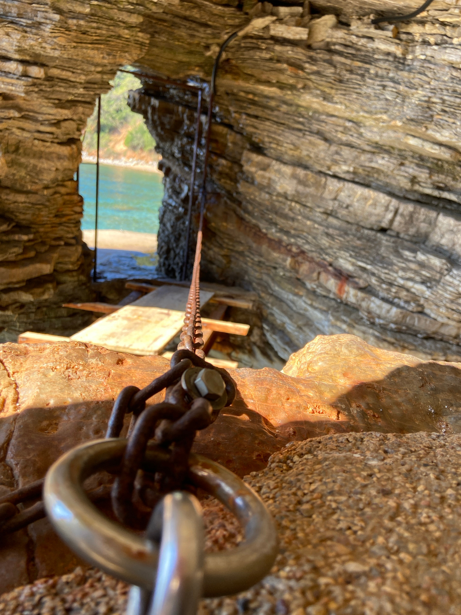 View from a precipitous height above the Adriatic Sea in Sveti Stefan, Montenegro. The perspective is downward through a narrow passage between rock formations. A series of wooden steps descend within…read more