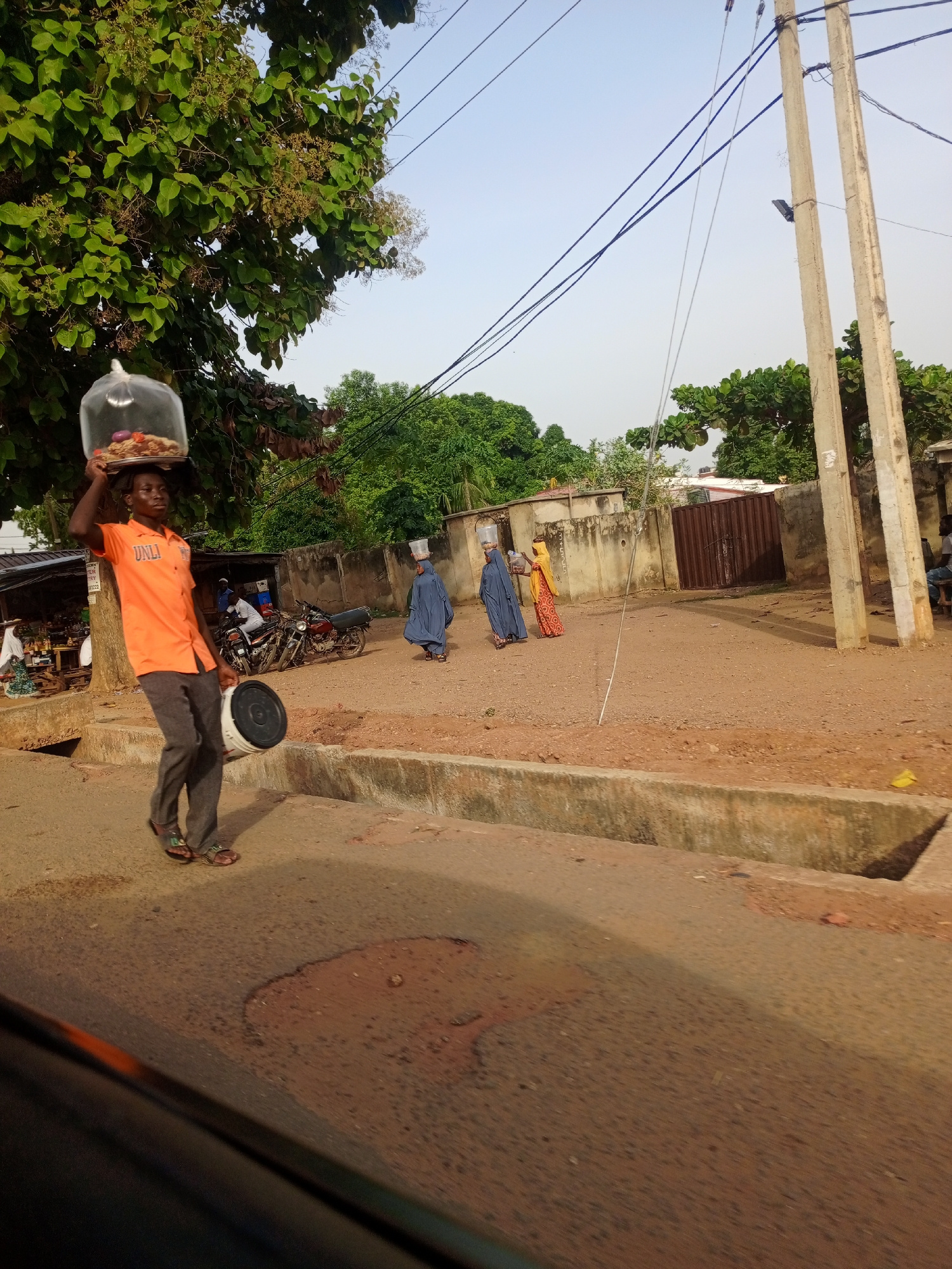 In Keffi, Nigeria, a young man in an orange t-shirt and grey trousers carries a covered tray on his head and a bucket in his right hand as he walks along the side of a road. Two women wearing traditio…read more