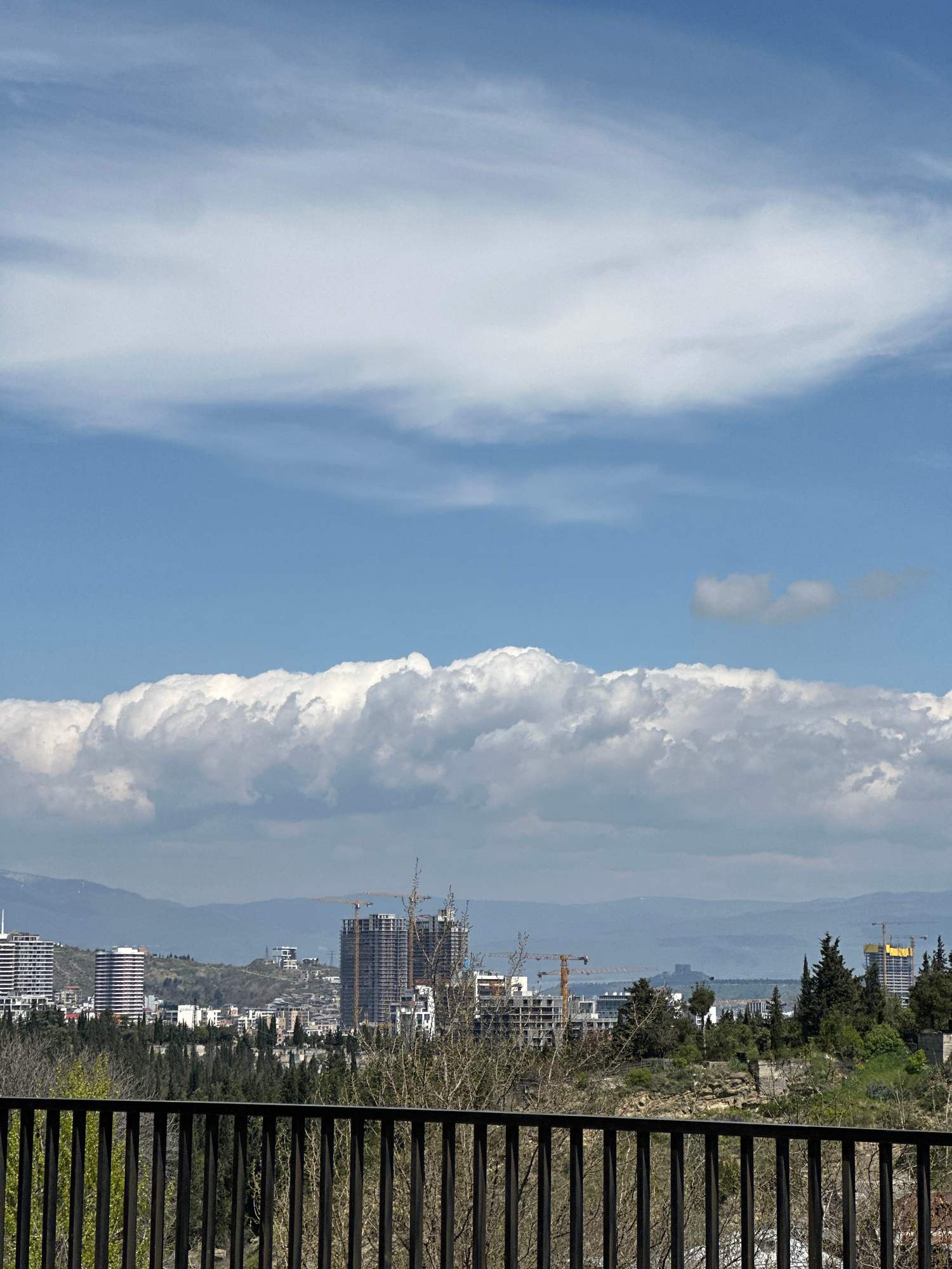 The image presents a wide, elevated view of a city under a bright sky. In the immediate foreground, a dark, slatted fence or railing runs horizontally across the bottom right, partially obscured by so…read more