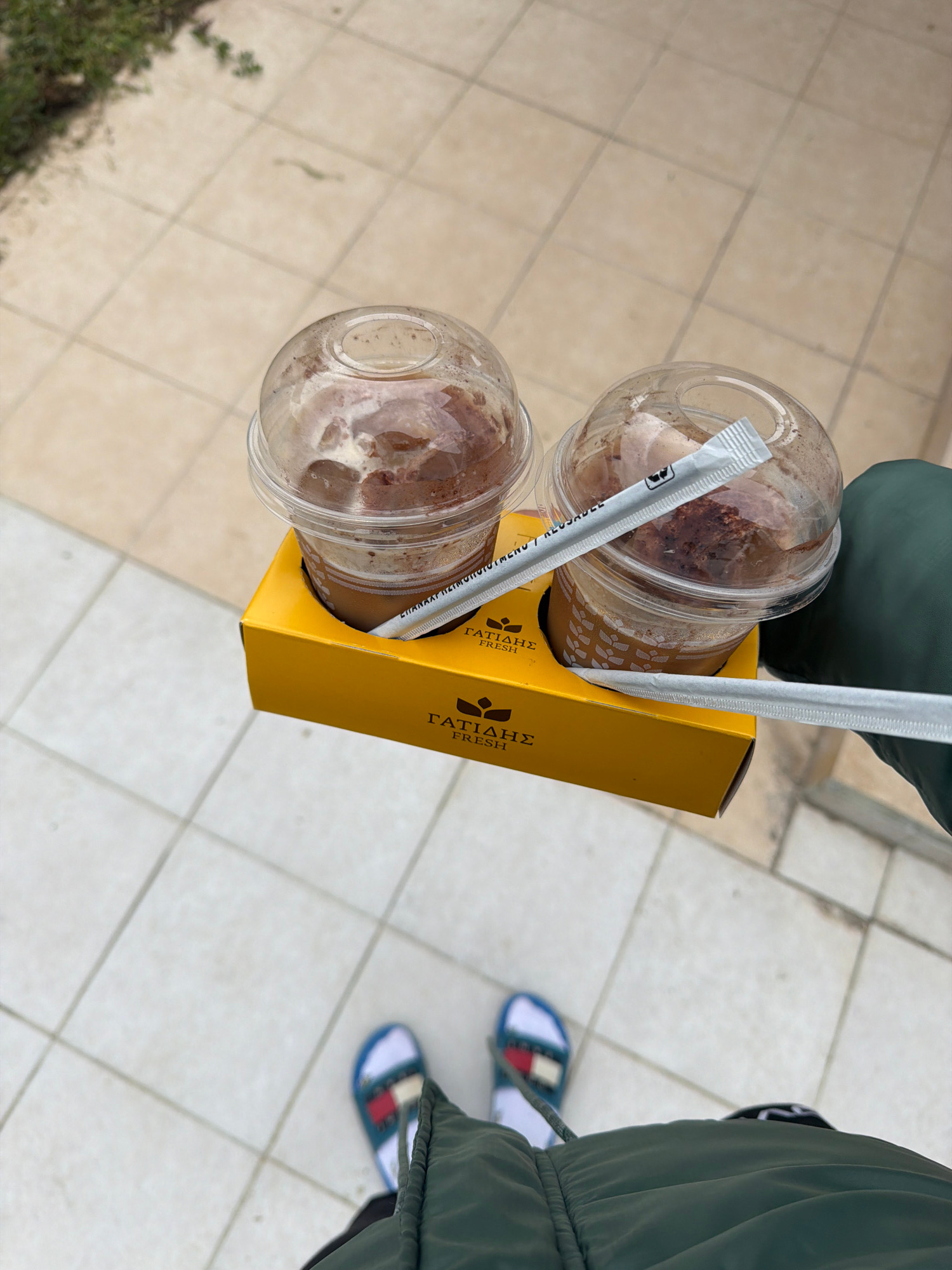 A top-down shot shows a person holding a yellow cardboard carrier containing two iced coffee drinks. The drinks are in clear plastic cups with dome lids and straws. The carrier has the words "ΓΑΤΙΑΔΗΣ…read more