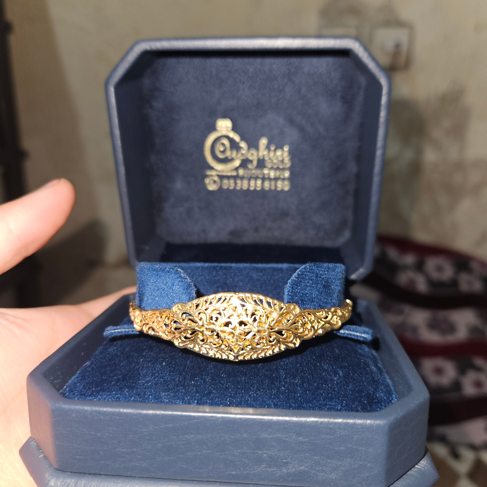 A gold filigree bracelet rests in a blue velvet-lined jewelry box. The box features the logo of "Jawharat Fes" (Jewel of Fez) along with a phone number, suggesting a location in Fez, Morocco. The box…read more