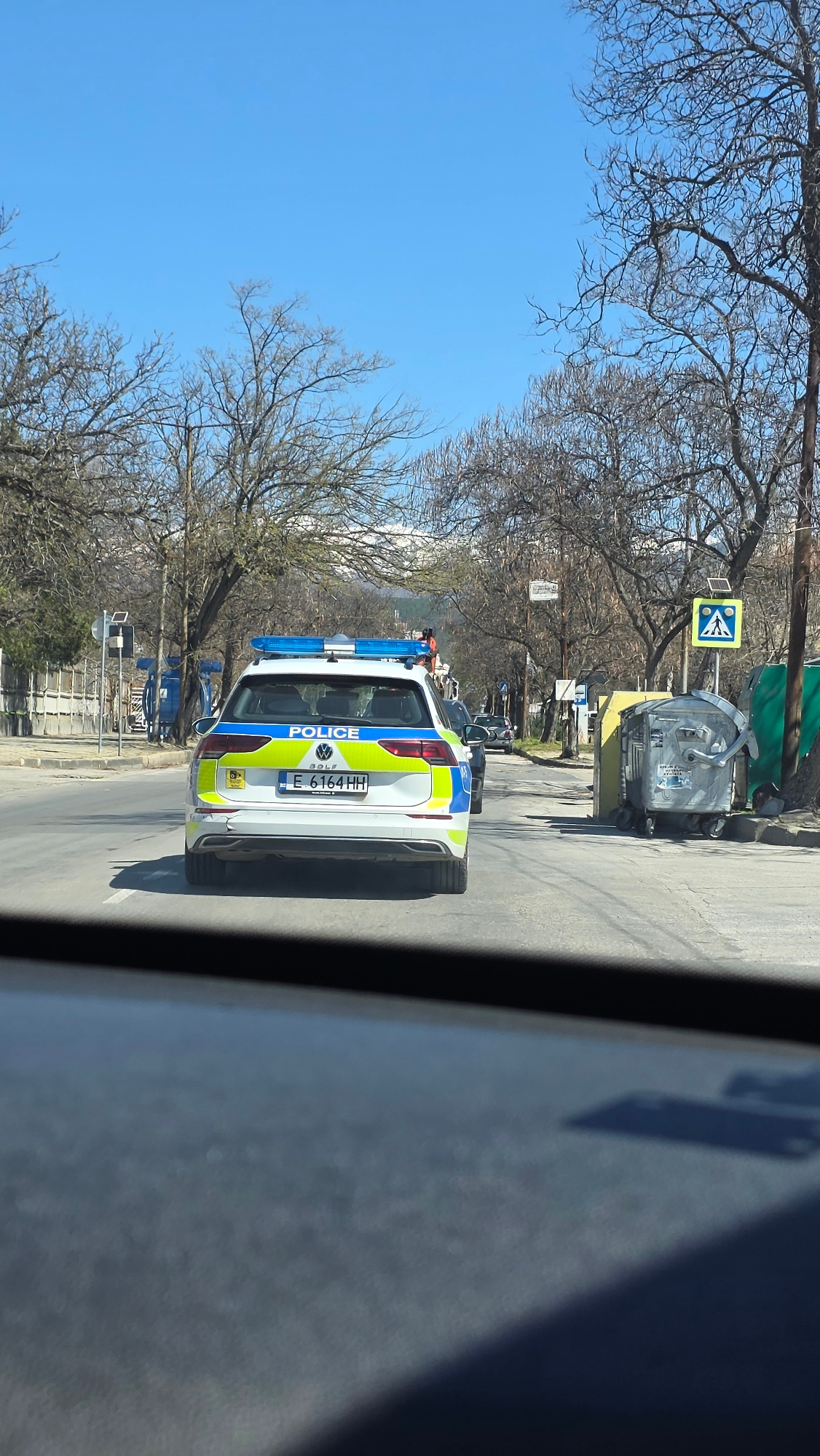 The image shows a white and blue Bulgarian police car with license plate number E-6164-HH on a road in Blagoevgrad, Bulgaria. The car is positioned in the middle of the lane, headed away from the came…read more