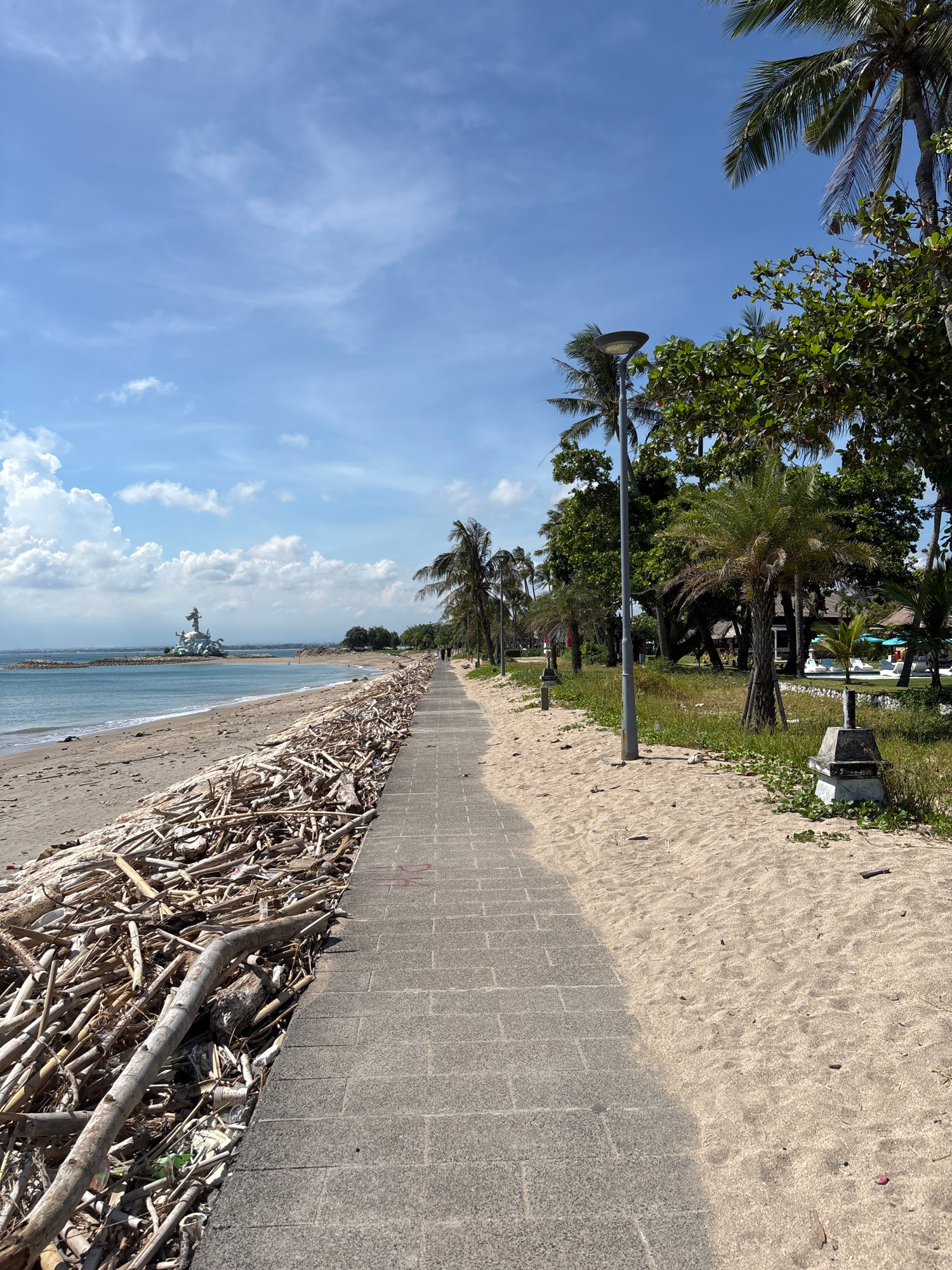 The image shows a beach in Kuta, Indonesia. A paved walkway runs along the right side of the frame, adjacent to a sandy area covered with a large pile of driftwood and debris. Beyond the debris is the…read more