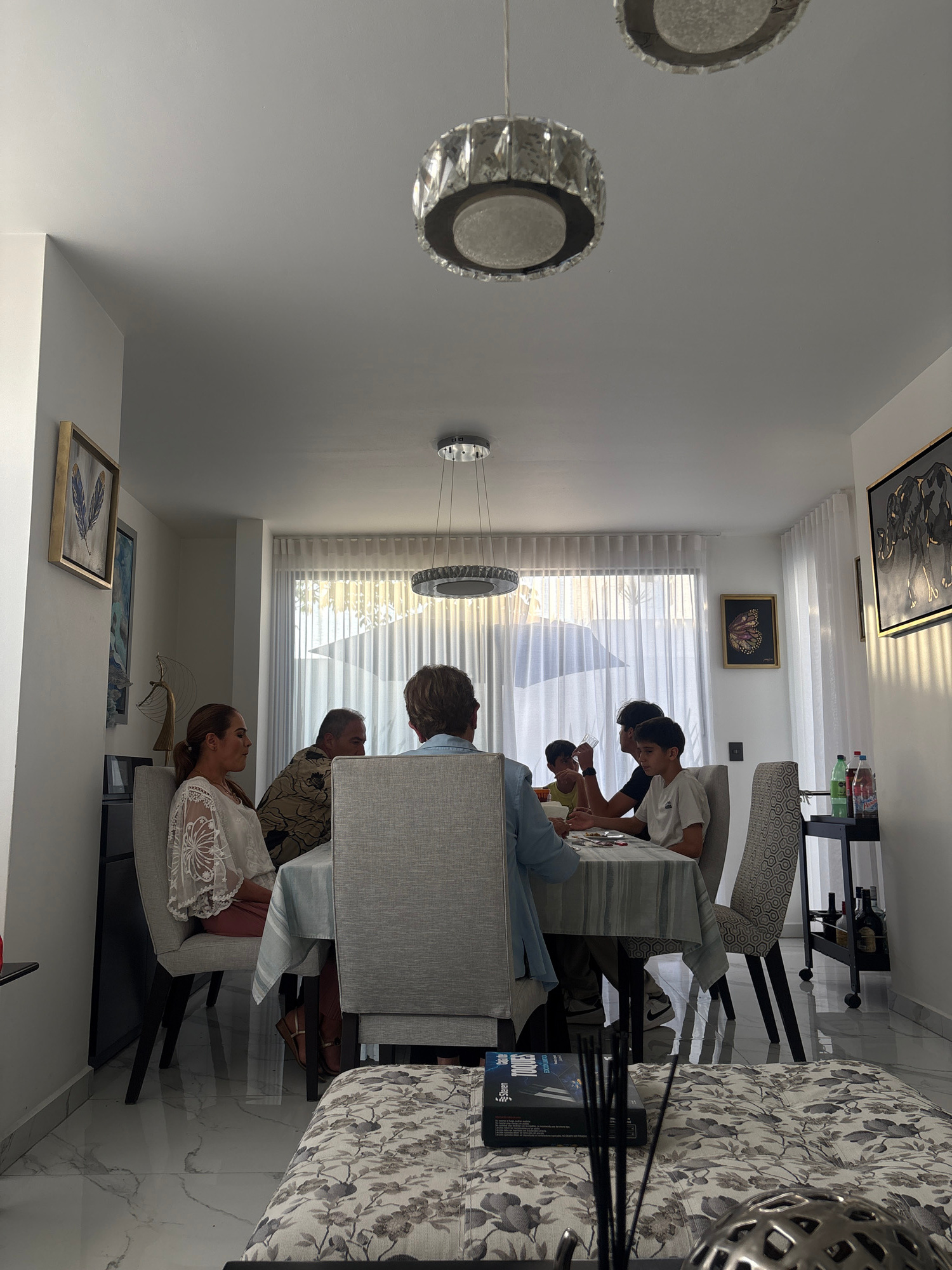 A family is gathered around a table for a meal in a well-lit room. Two young people are at one end of the table, potentially interacting with a baby or small child. Three older adults are seated on th…read more