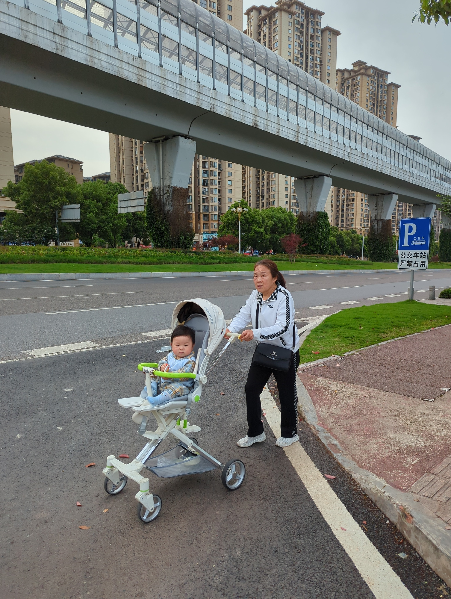 An outdoor, slightly rotated, full-shot photograph captures a woman pushing a child in a stroller on a sidewalk in an urban setting in Jiangjin, China. The woman, positioned on the right side of the f…read more