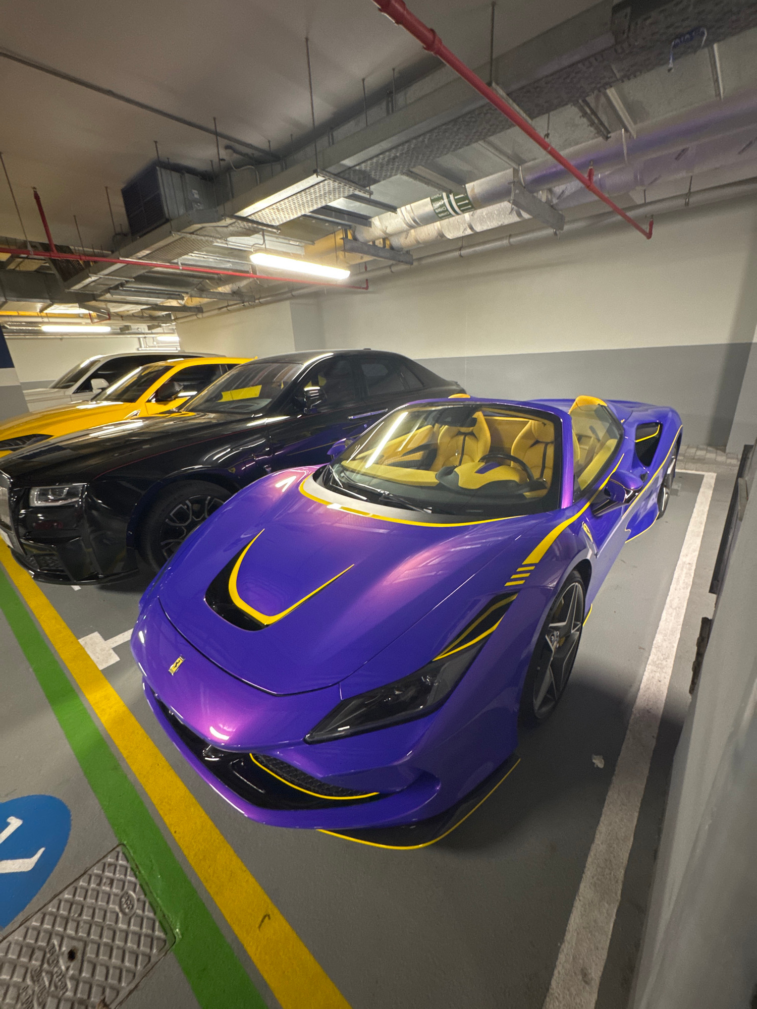 The image shows a parking garage in Dubai, United Arab Emirates with a blue and yellow sports car. The car is parked in a designated parking spot with yellow and green lines. The parking garage is welโฆread more
