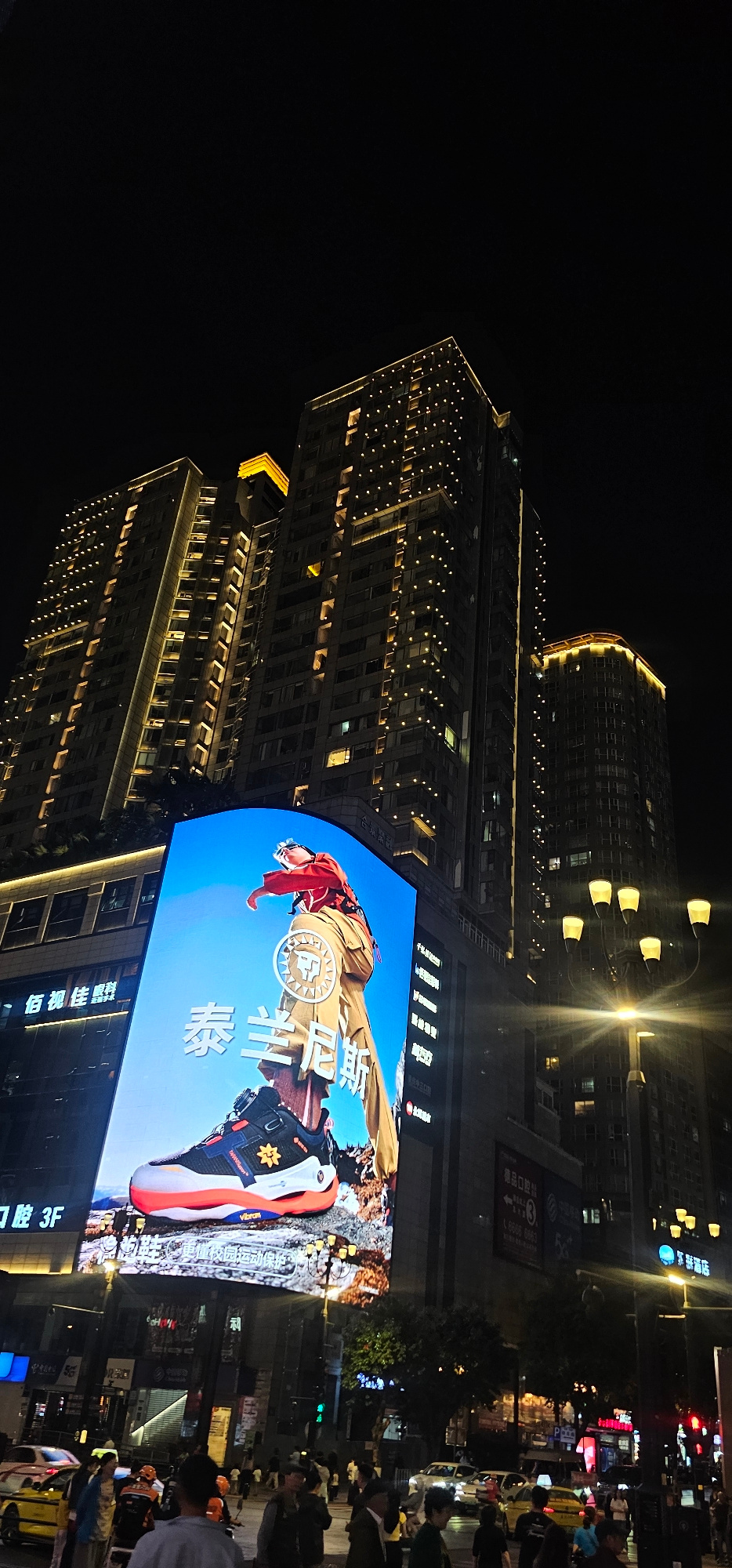 A nighttime view in the Yuzhong District, China, depicts illuminated high-rise buildings adjacent to a large digital display screen. The screen shows an advertisement featuring a person and footwear.…read more