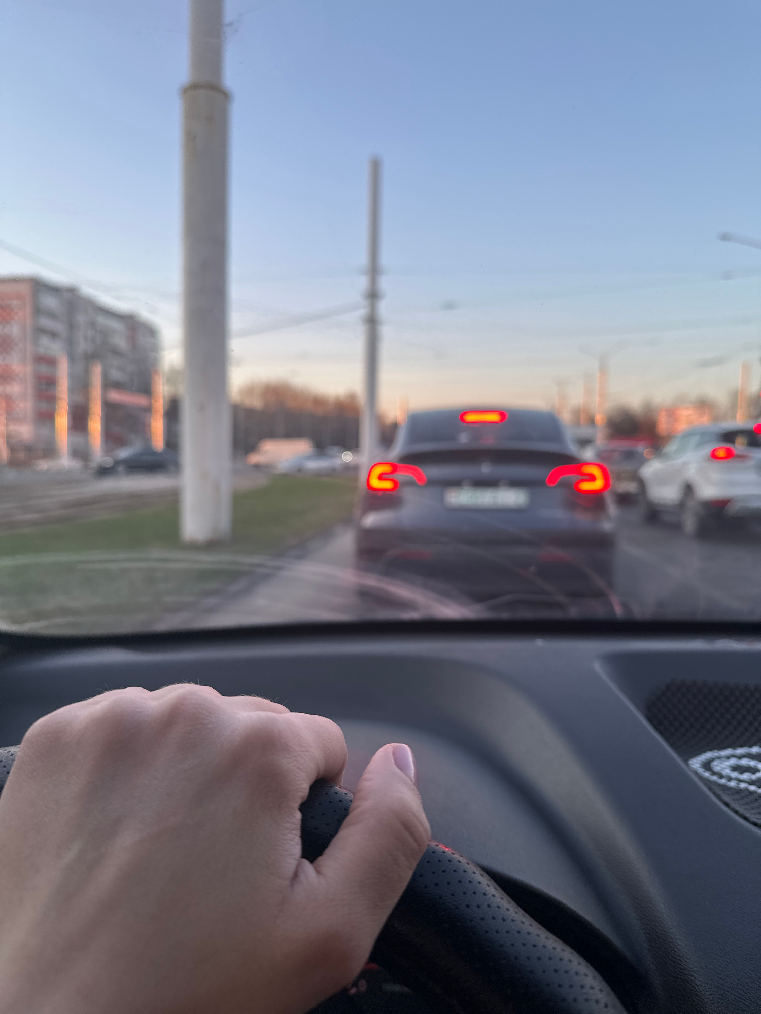 The image shows a view through a car windshield, seemingly taken from the driver's seat. The hand of the driver is visible, holding the steering wheel. Outside the car, there is traffic on the road, w…read more