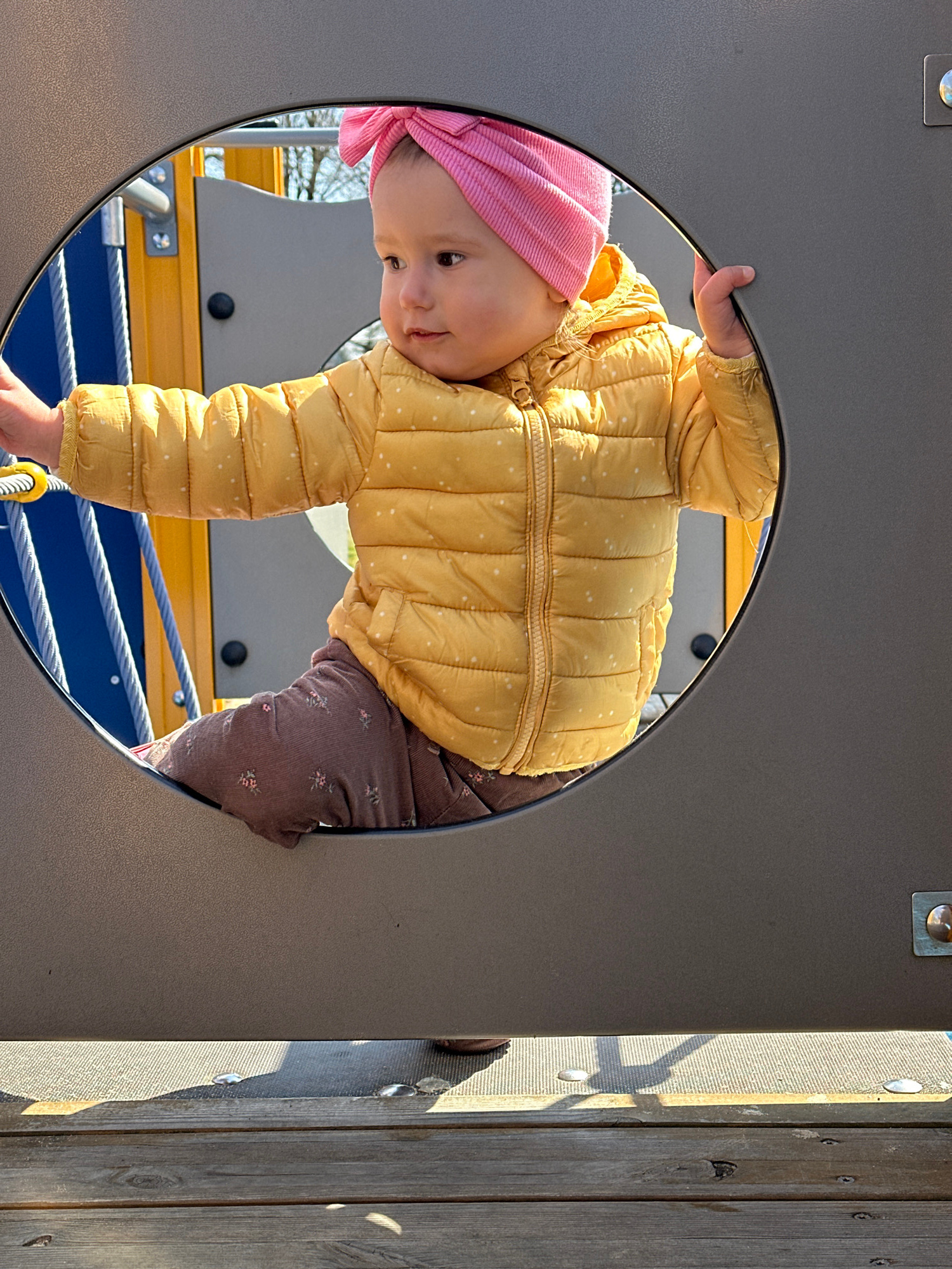 A child, wearing a pink cap, a yellow quilted jacket, and patterned brown pants, is pictured framed in a circular opening in a grey playground structure. The child is bending and reaching through the…read more