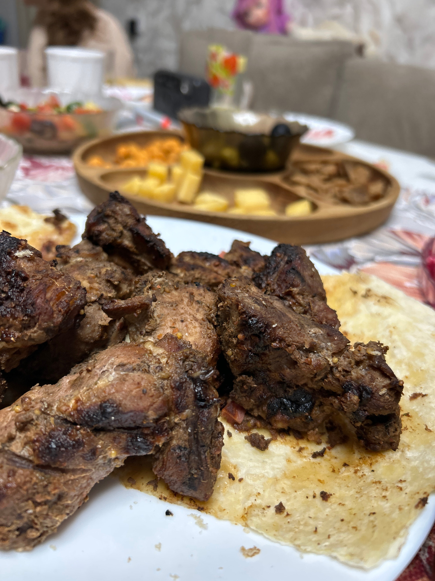 The image shows a close-up of food on a white plate. Specifically, there are pieces of grilled or roasted meat served with a flatbread or pita bread. In the background, slightly out of focus, is a woo…read more