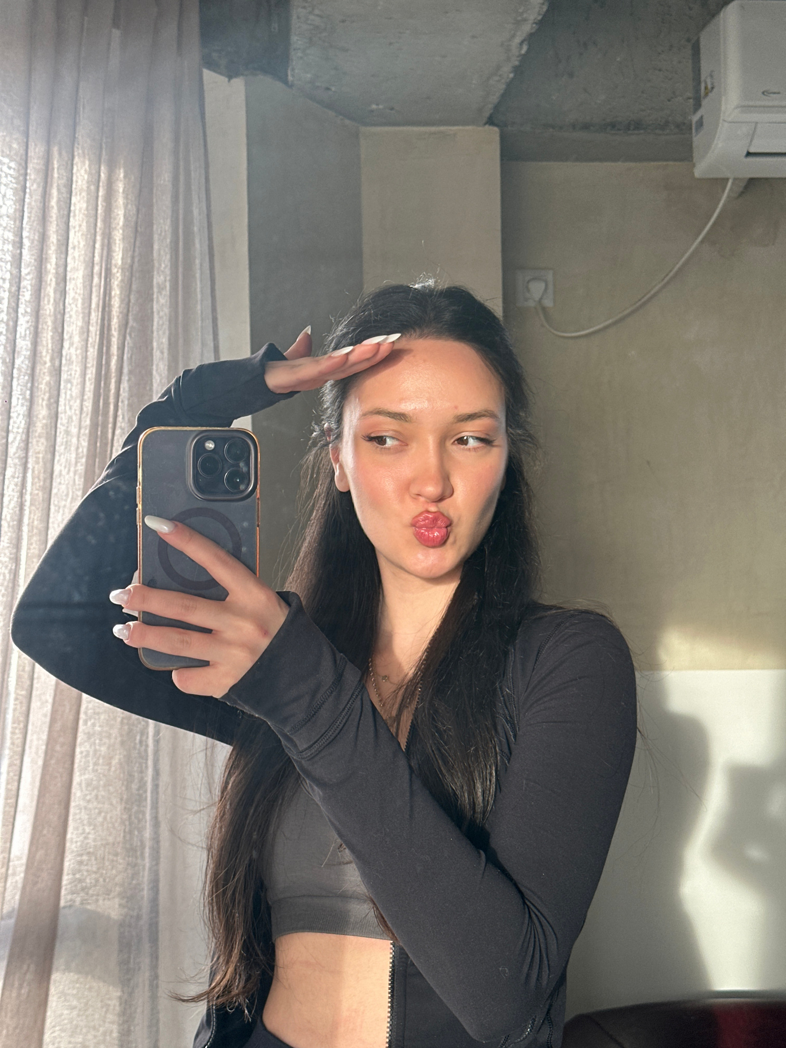 A female individual is depicted in a mirror selfie taken indoors in Zovuni, Armenia. The individual, with dark, long hair, is wearing a black long-sleeved athletic top unzipped to reveal a dark grey s…read more