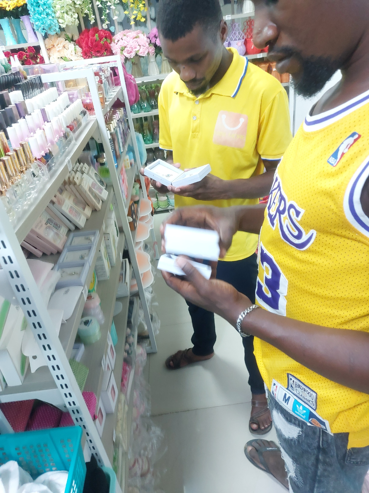 Two African males stand indoors, looking at jewelry. One wears a yellow Lakers jersey and the other a yellow collared shirt. The jewelry is arranged in a white-framed shelf. The location appears to be…read more