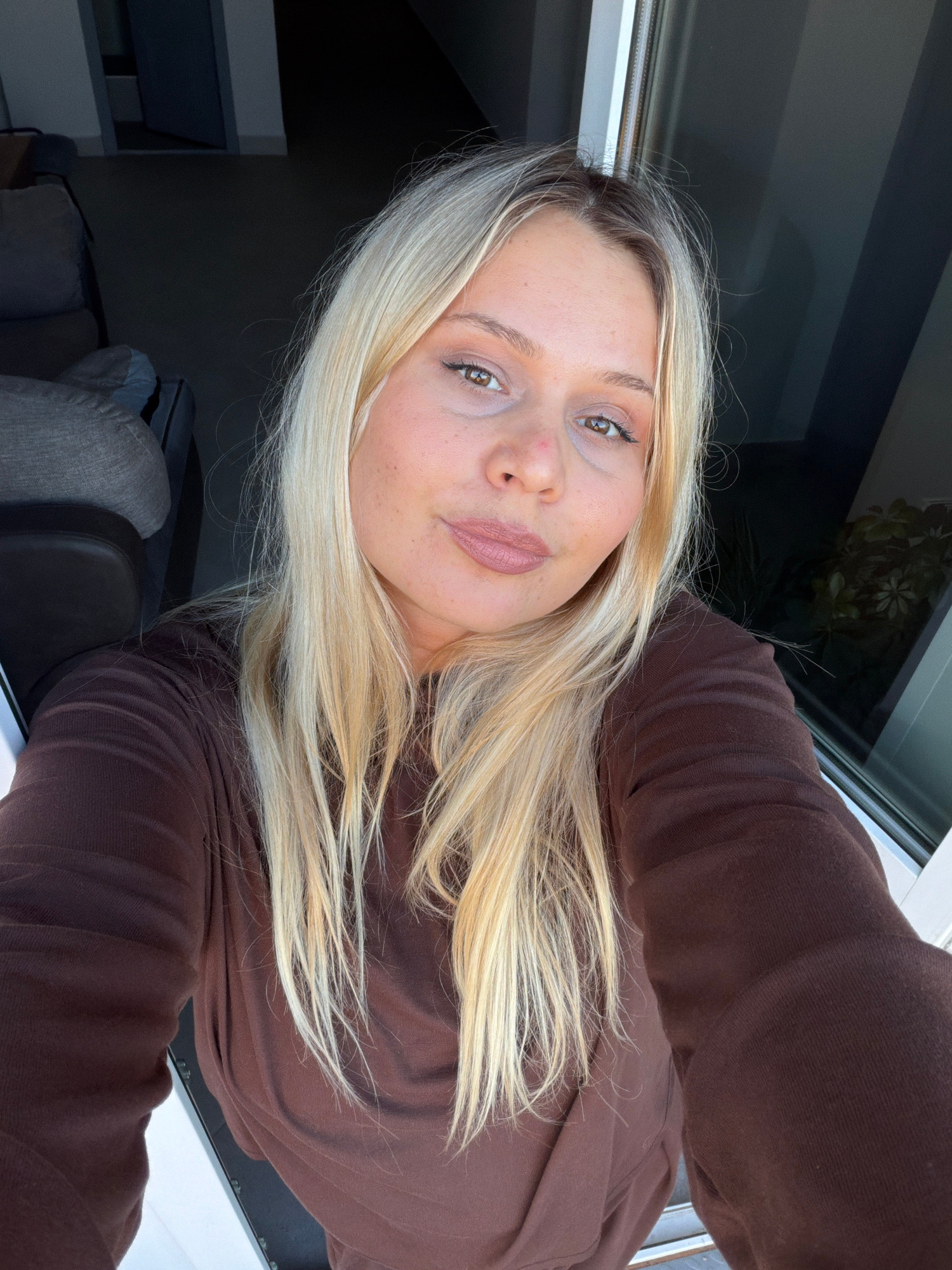 A young woman with blonde hair is taking a selfie indoors. She's wearing a brown long-sleeved shirt and her hair is styled in loose waves. The background shows a window with plants visible outside and…read more