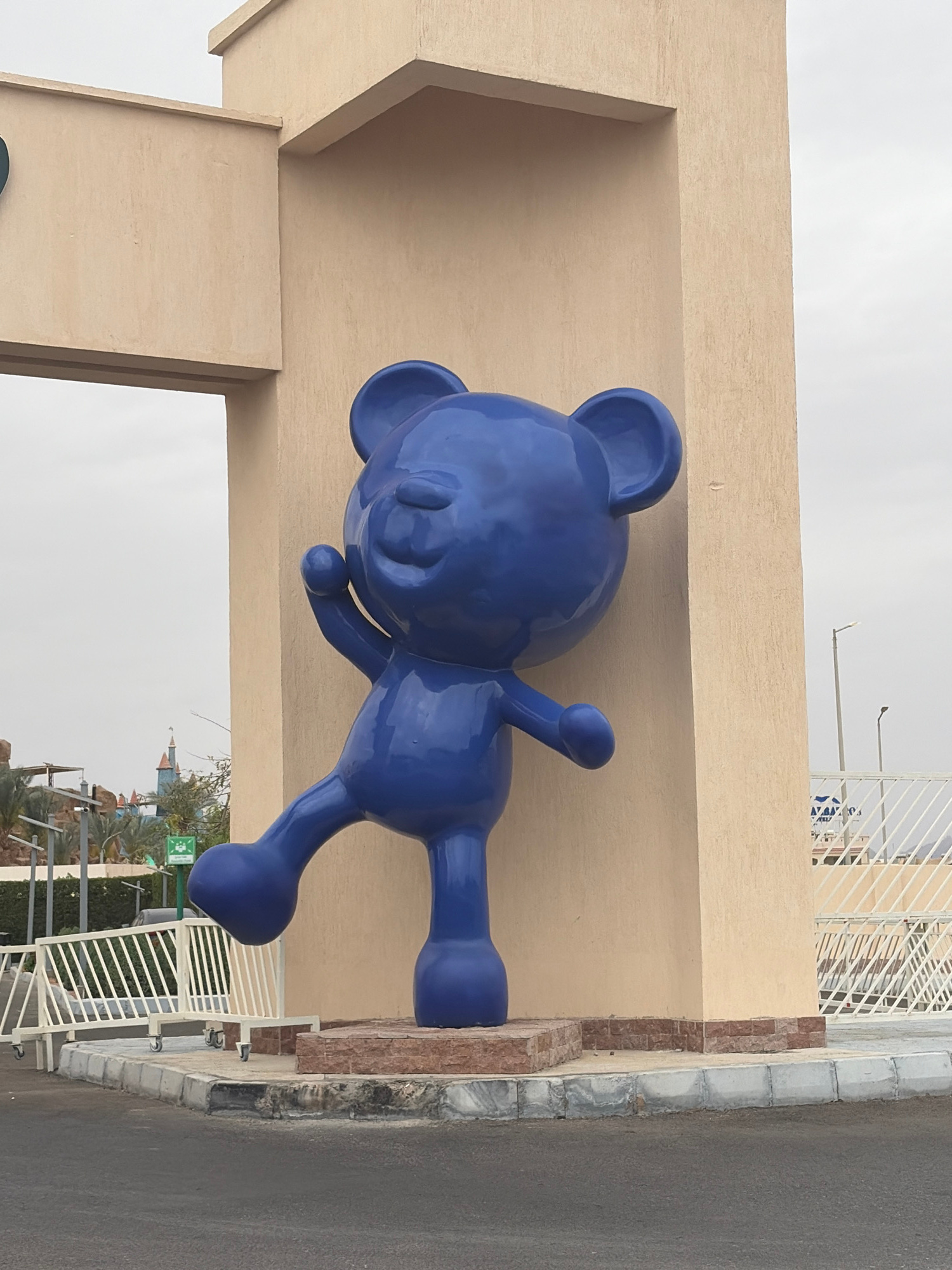 The image shows a large, blue, stylized bear sculpture. The sculpture is positioned at the entrance to a location, seemingly above an archway or entrance feature made of beige material. The bear has a…read more
