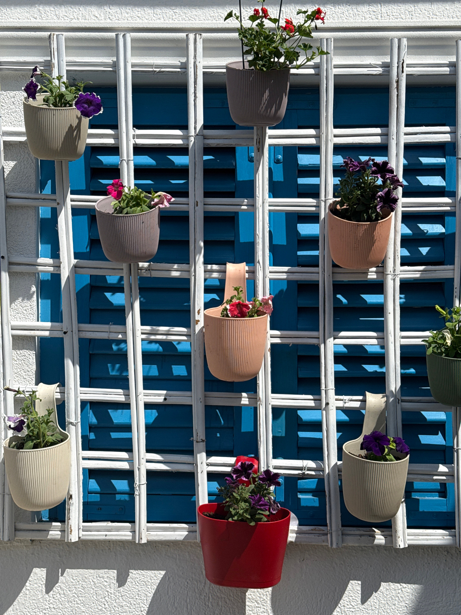 The image displays a vibrant outdoor decorative arrangement, likely on the facade of a building in Podgorica, Montenegro. A white, somewhat weathered wooden or bamboo-like trellis is prominently featu…read more