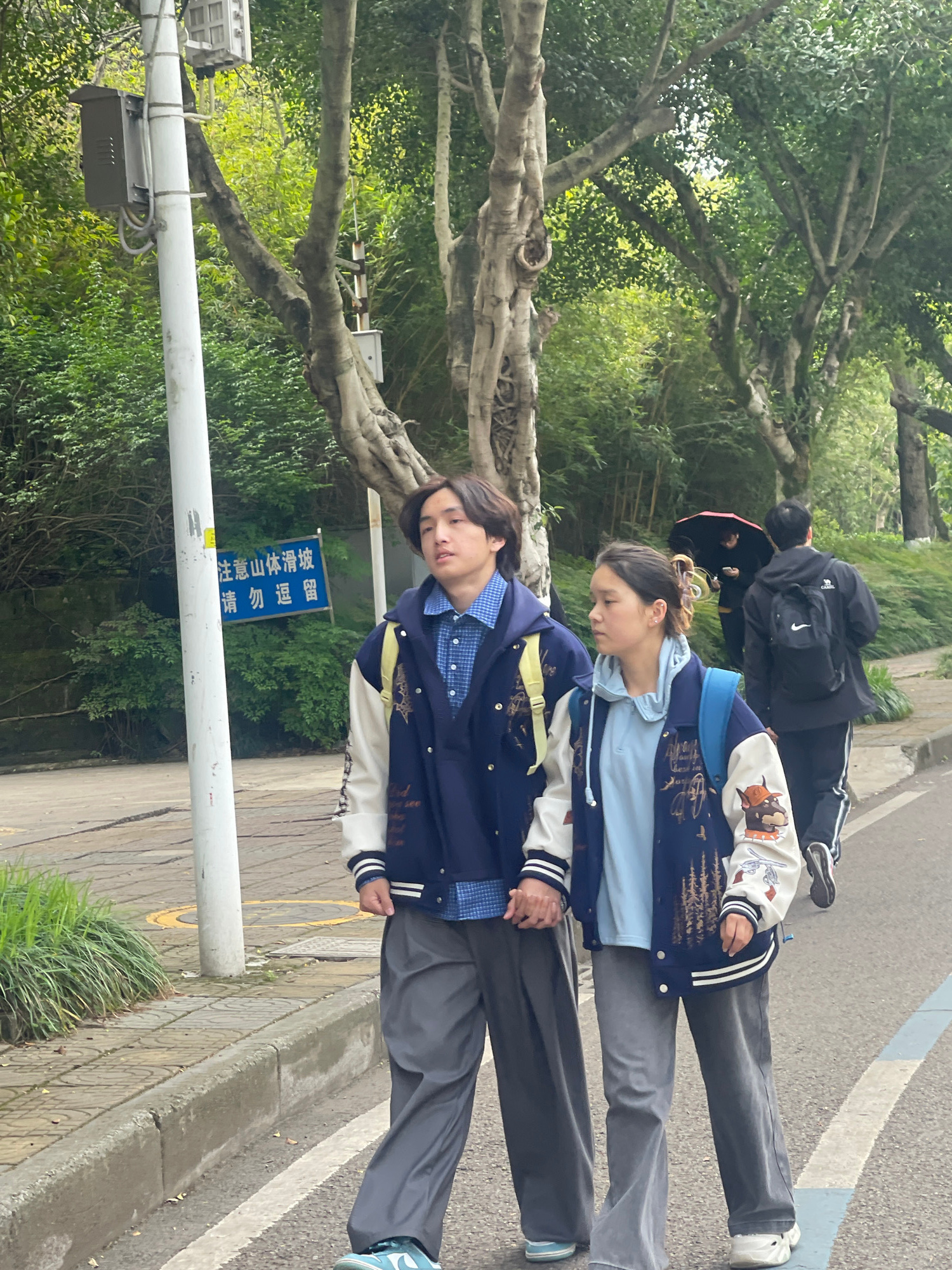 The image shows a city street scene, likely in the Chongqing High-tech Zone, China. Two young individuals, dressed in matching letterman-style jackets, are standing or walking on a sidewalk next to a…read more