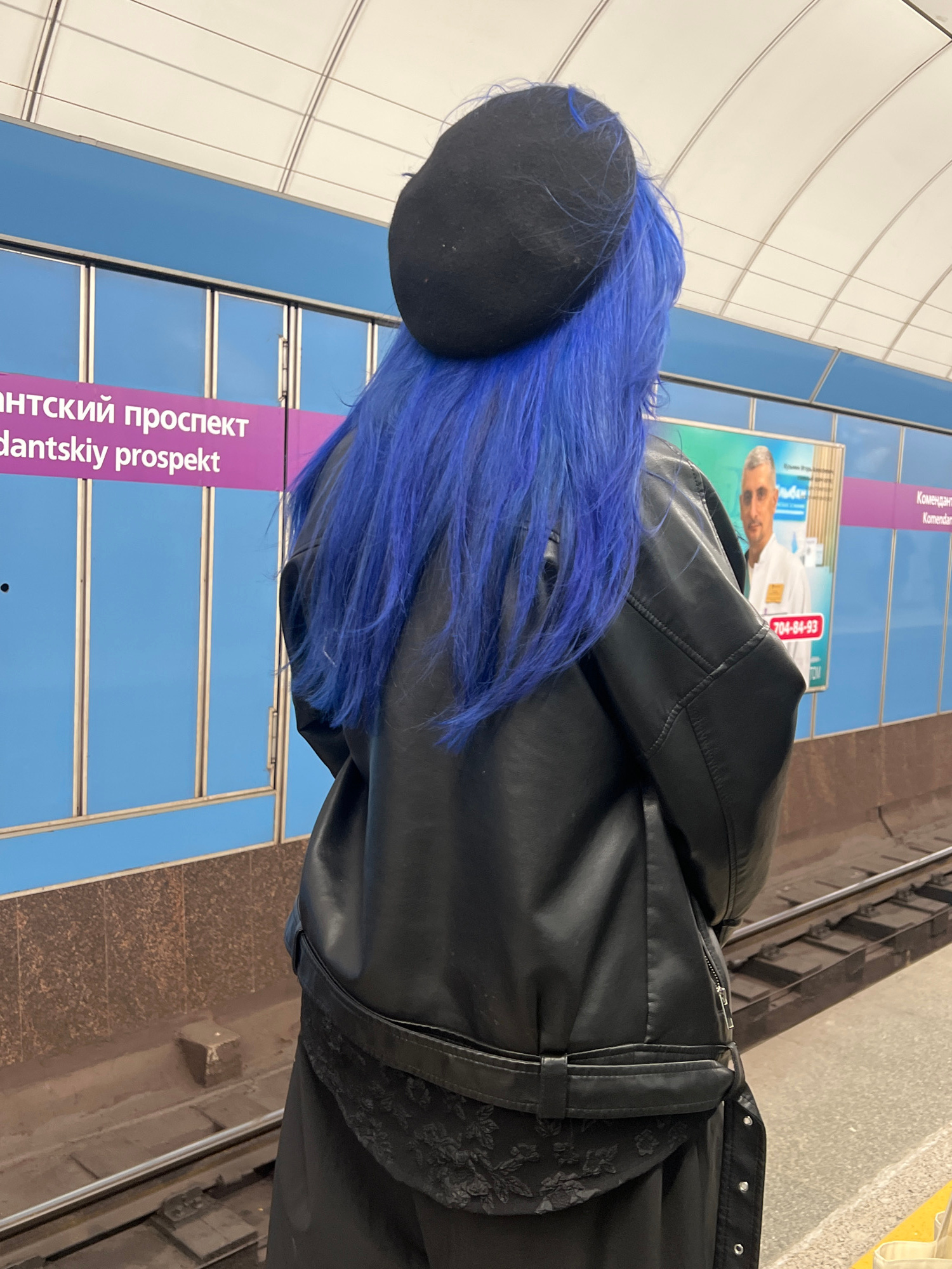 From a rear perspective, a person with vibrant, electric blue hair, partially covered by a black beret or flat cap, stands on a modern subway platform. They are wearing a black, leather-look jacket, w…read more