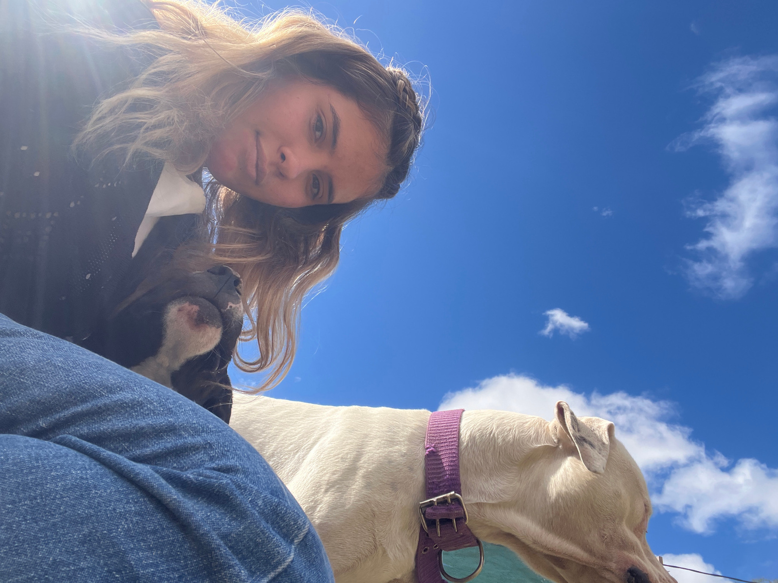 A low-angle photograph taken in Sumalao, Argentina, features a woman holding two dogs. The sky, a clear blue with scattered white clouds, is visible behind the subjects. The woman has fair skin and bl…read more