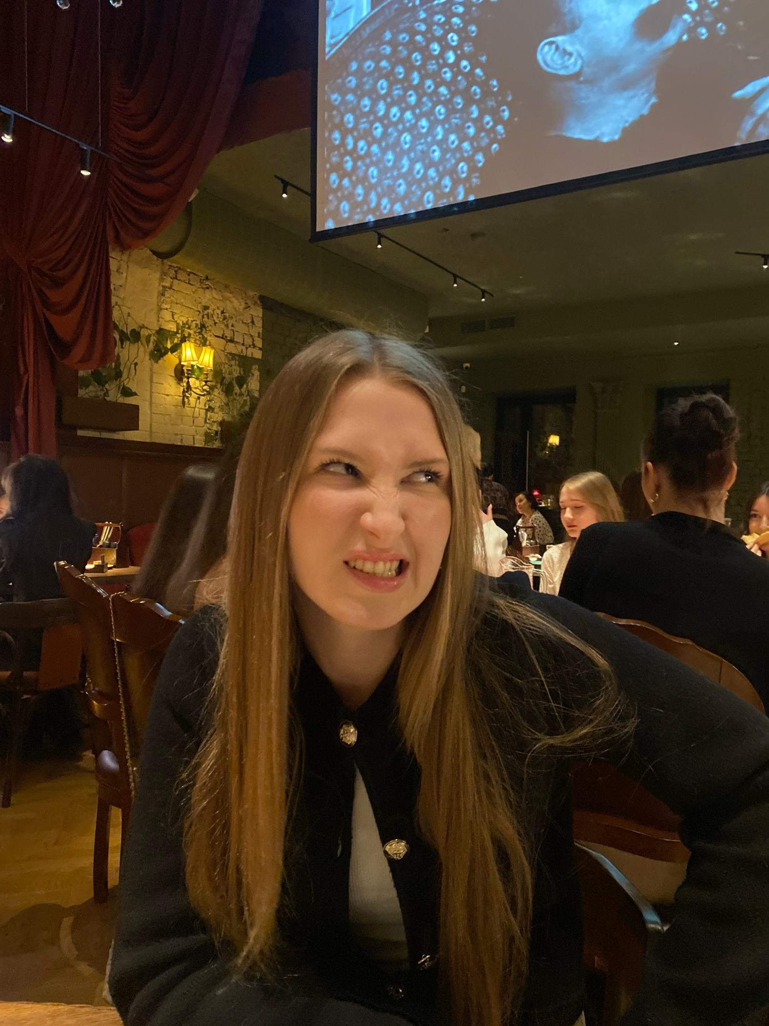 A young woman with long brown hair is posing for a selfie, with an impish grin, in what appears to be a restaurant setting. She is wearing a dark blazer with gold buttons over a white top. In the back…read more