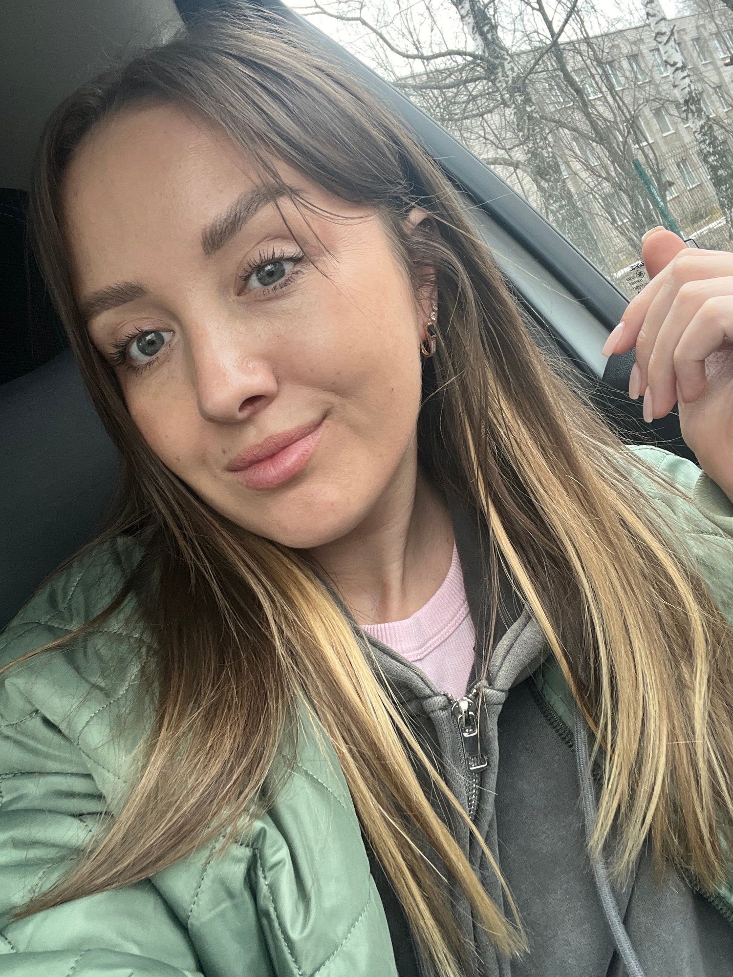 A woman with long, light brown and blonde hair is sitting in a car. She is wearing a light pink sweater and a gray zip-up hoodie under a light green quilted jacket. Her left hand is holding the car’s…read more