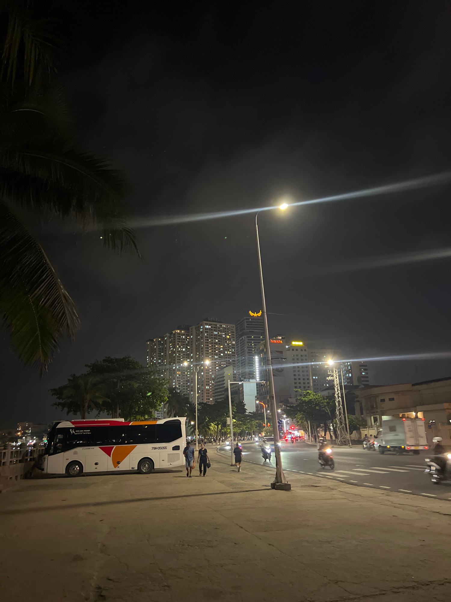 The photograph shows a nighttime scene in Bắc Nha Trang, Vietnam. Tall buildings with lighted windows dominate the skyline. A street with traffic is visible, lit by streetlights. A large white bus wit…read more