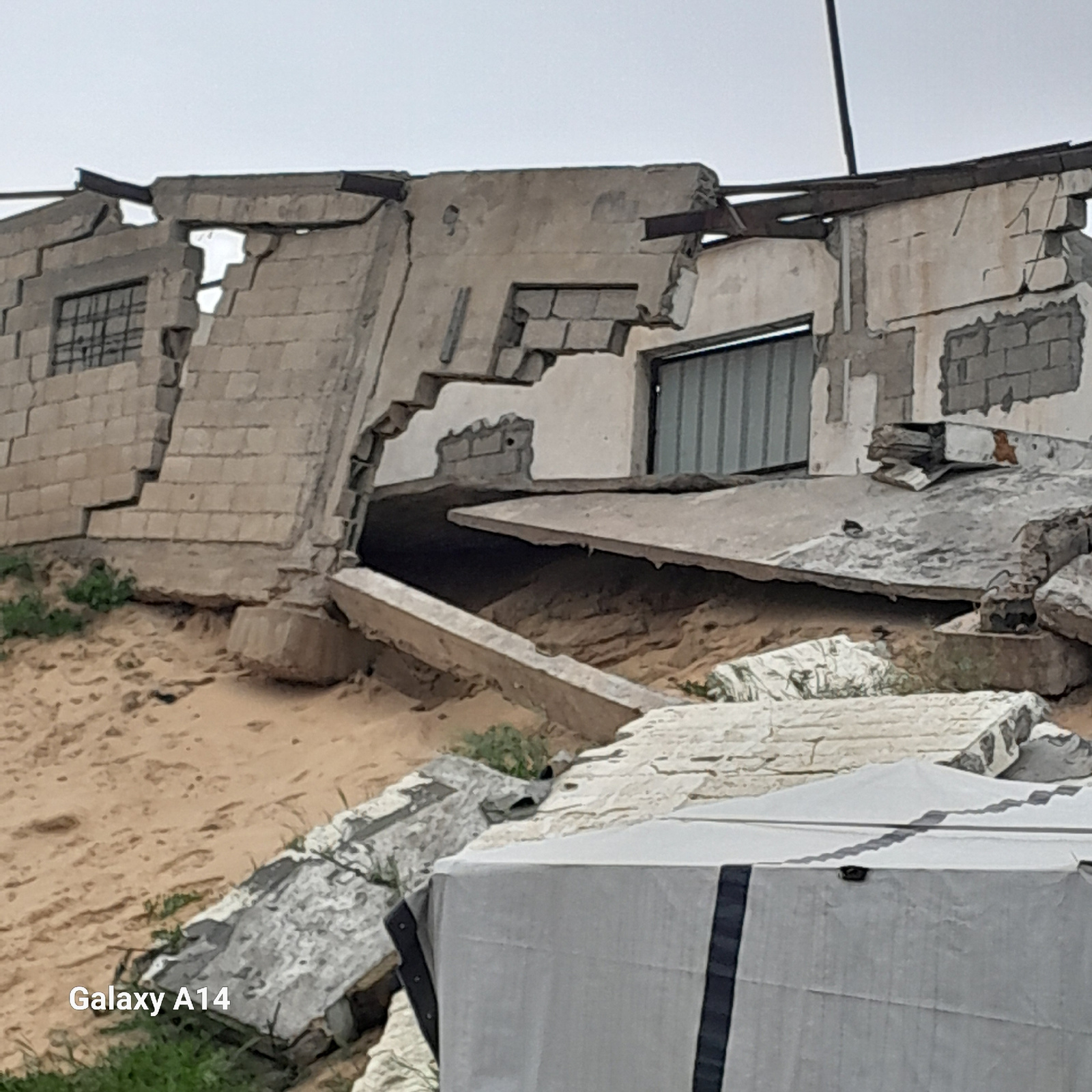 The image depicts a severely damaged building in Khan Yunis, Palestinian Territory. The structure exhibits extensive destruction with missing walls and crumbling brickwork. Windows are either broken o…read more