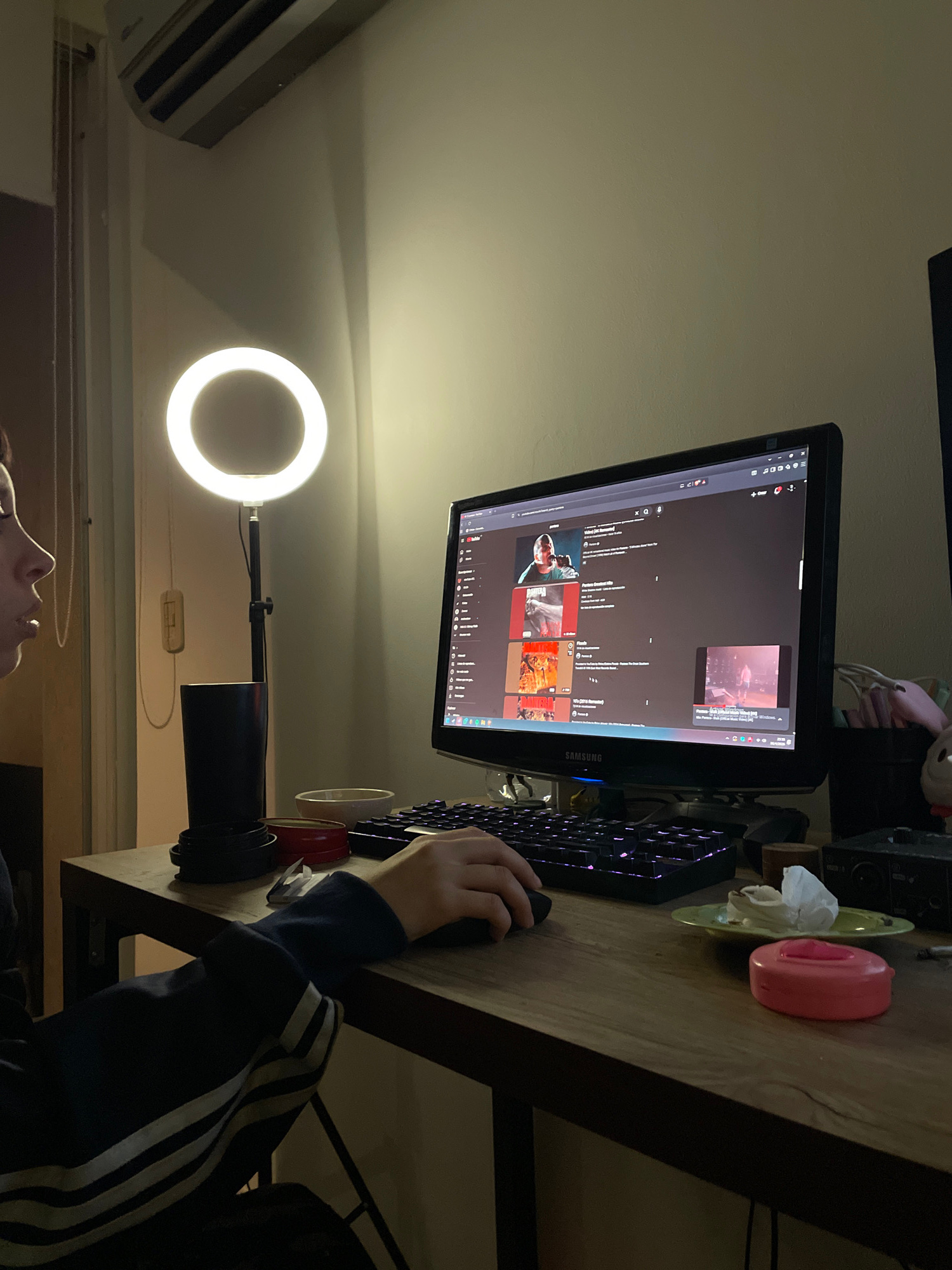 The image captures an indoor scene at night or in a dimly lit room, focusing on a person interacting with a computer setup. The person, whose lower face and right hand are visible, is seated at a wood…read more