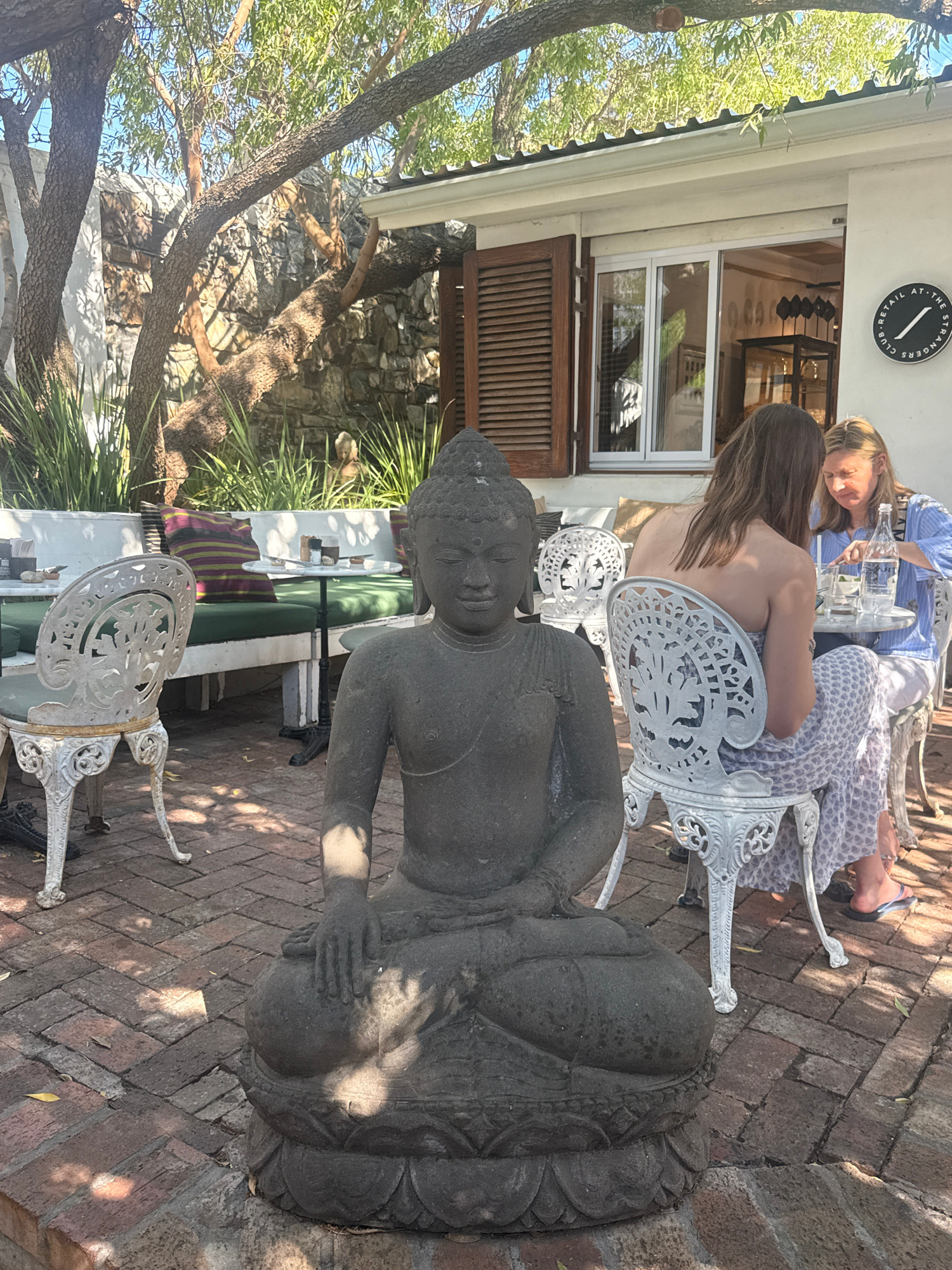 A photograph depicts an outdoor scene, likely a patio or garden area of a cafe or restaurant, possibly in Cape Town, South Africa, given the building style and foliage. The foreground is dominated by…read more
