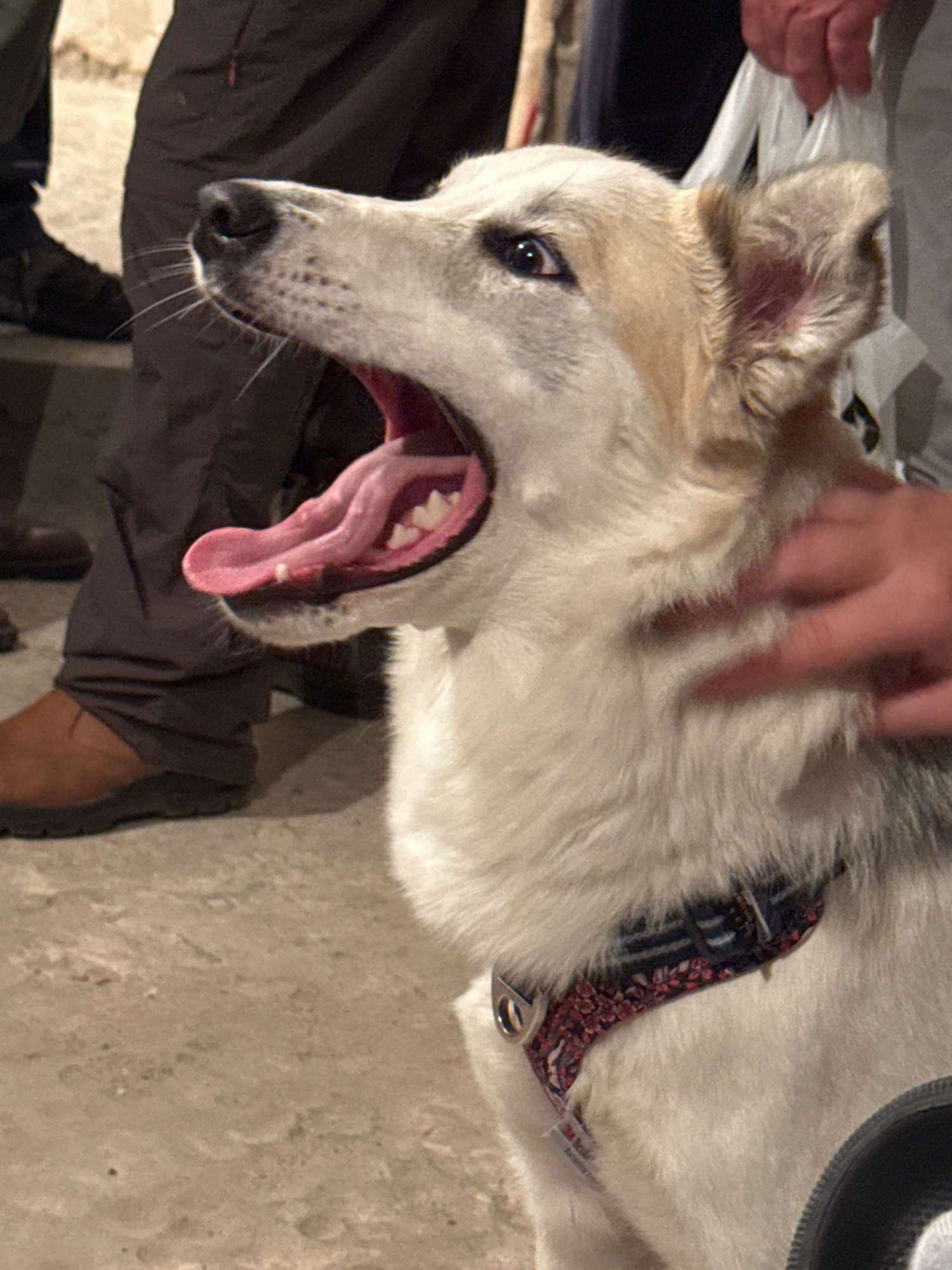 A close-up, indoor shot depicts a tan and white dog with its mouth open and tongue extended. A person's hand is seen petting the dog's head. The dog is wearing a collar with a floral pattern. A portio…read more