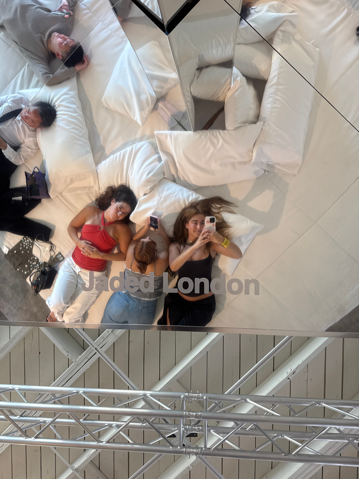 The image captures an overhead perspective within a structure in West Hollywood, USA, featuring a unique setup of interconnected mirrors that reflects a scene of several people casually lying on a mat…read more