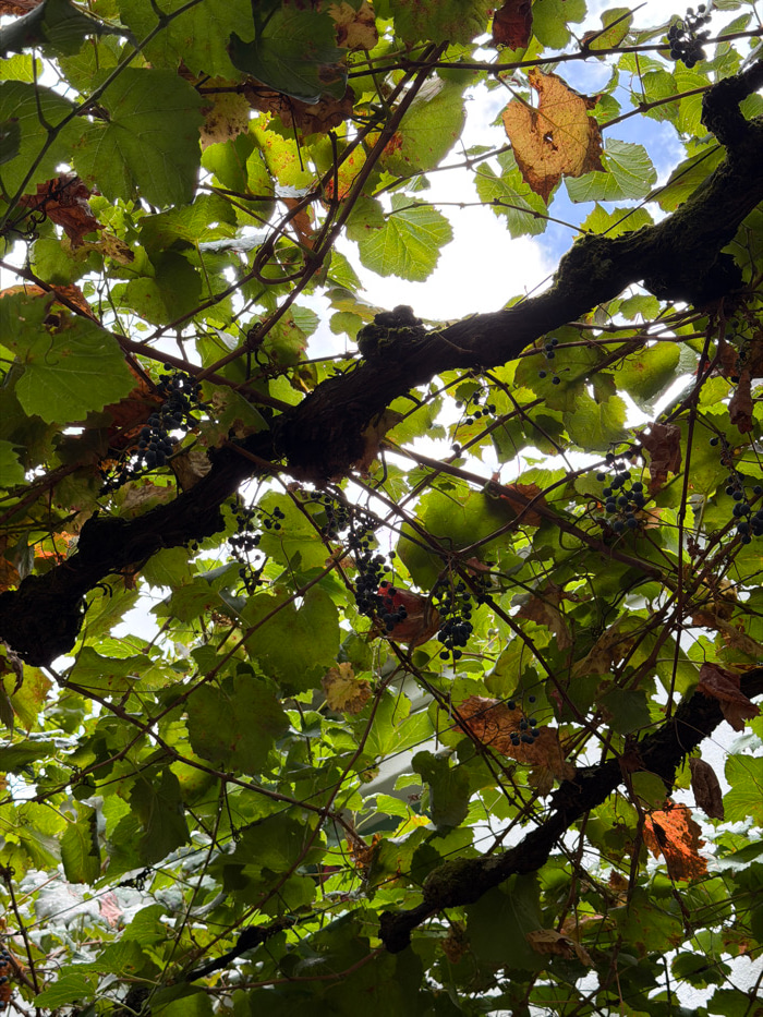 The image displays an upward perspective through a dense canopy of a grapevine in Drakenstein Nu, South Africa. Prominent features include thick, gnarled dark brown vine branches, some with visible mo…read more